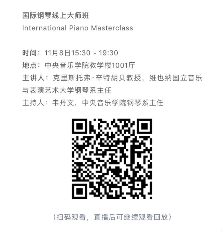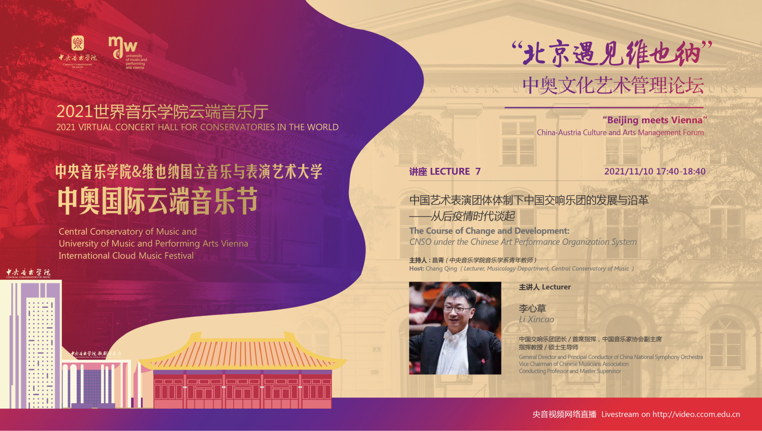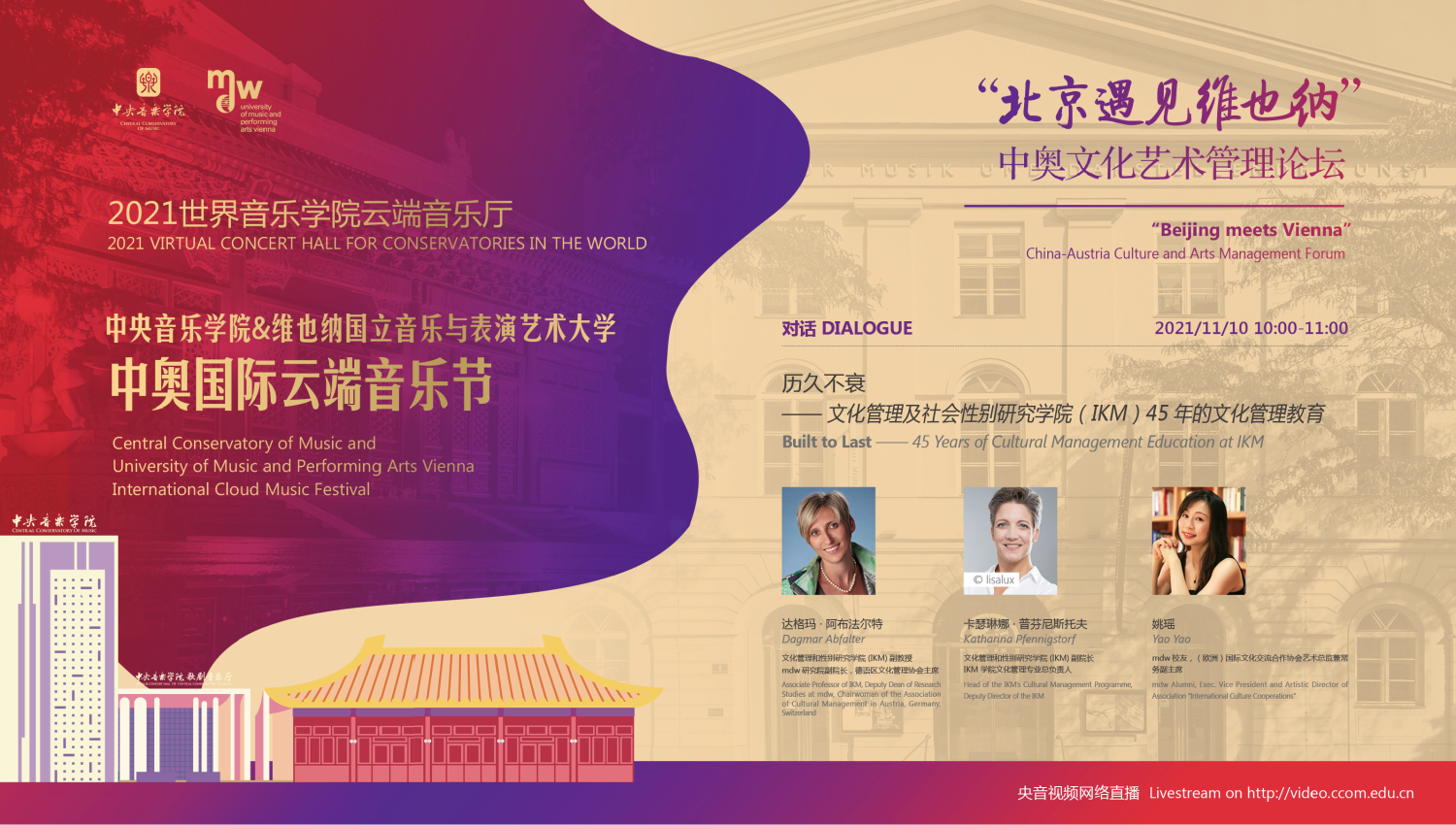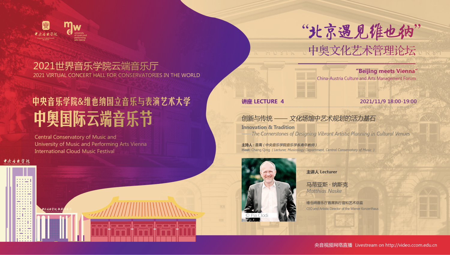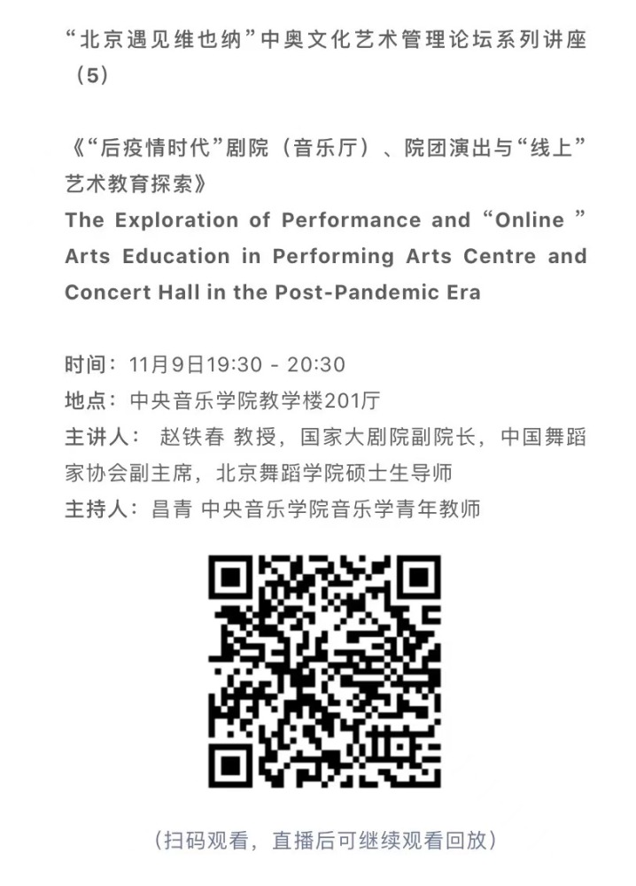 11月8日-10日期间的双城“国际音乐线上大师班”,将由维也纳国立音乐与表演艺术大学钢琴系主任克里斯托弗·辛特胡贝和best365中国官方网站校长、指挥系博士生导师俞峰为双方学生授课;同时,在“中奥文化艺术管理论坛”上,best365中国官方网站校长俞峰、维也纳国立音乐与表演艺术大学校长乌里克·祖茜、best365中国官方网站教授和云峰、国家大剧院副院长赵铁春、维也纳音乐厅首席执行官和艺术总监马蒂亚斯·纳斯克、维也纳广播交响乐团常务总监克里斯托夫·贝切尔博士、中国交响乐团团长和首席指挥李心草、维也纳国立音乐与表演艺术大学文化管理及社会性别研究学院副院长卡瑟琳娜·普芬尼斯托夫、达格玛·阿布法尔特副教授和(欧洲)国际文化交流合作协会艺术总监姚瑶等中奥各领域的专业文化艺术管理专家和学者,将举办专题讲座和访谈节目,从不同的视角探讨文化艺术管理的内涵与外延。