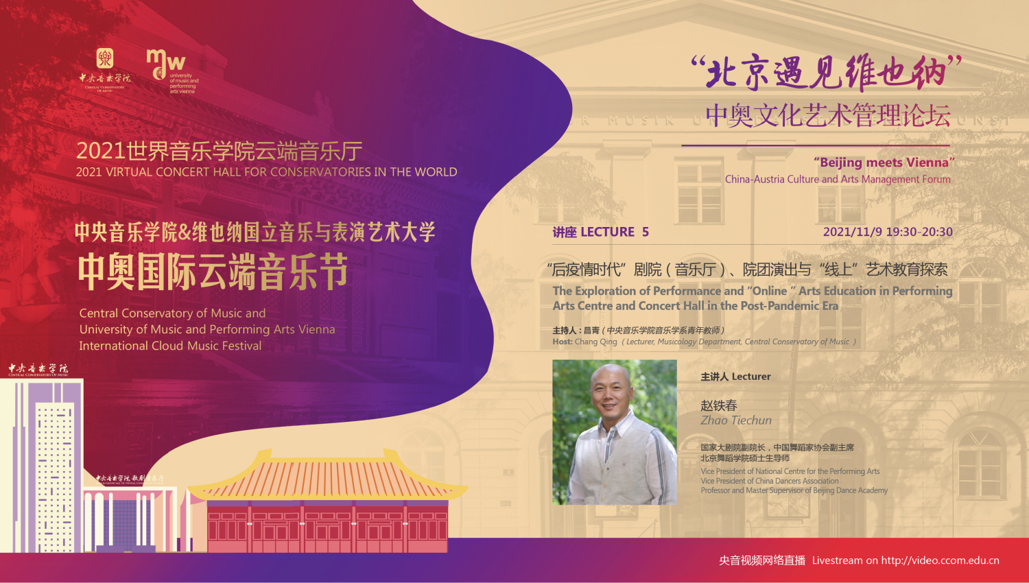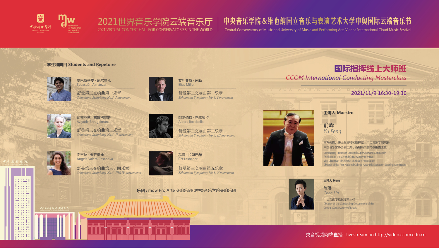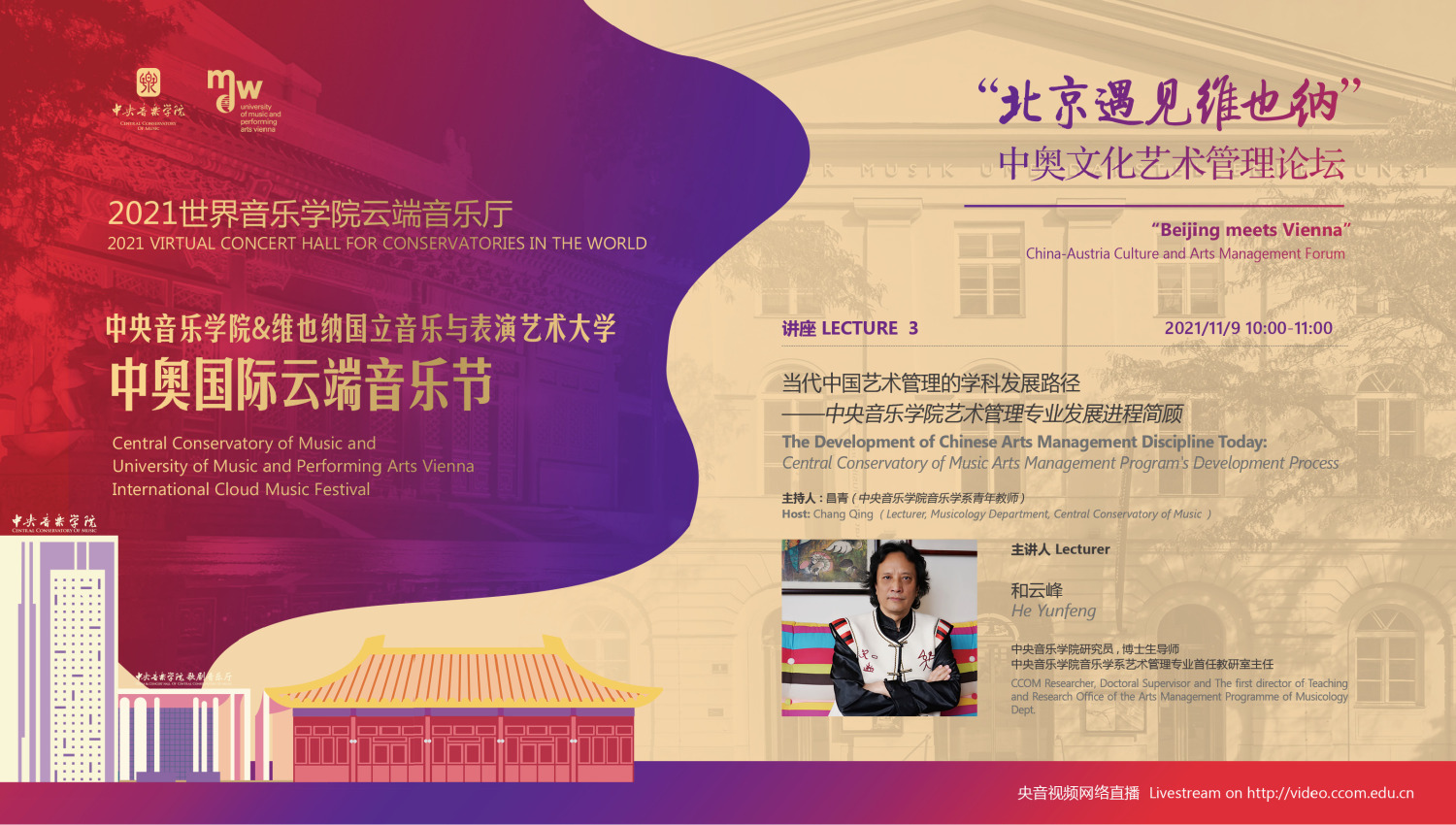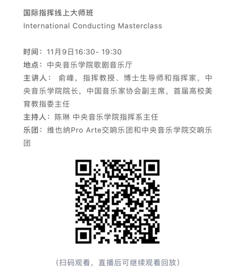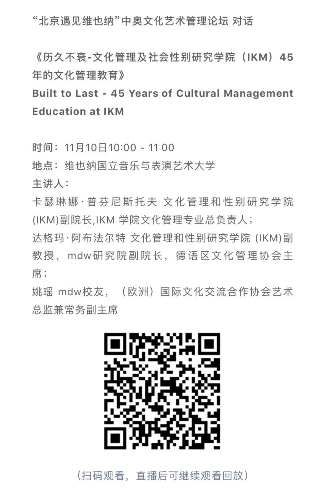11月8日-10日期间的双城“国际音乐线上大师班”,将由维也纳国立音乐与表演艺术大学钢琴系主任克里斯托弗·辛特胡贝和best365中国官方网站校长、指挥系博士生导师俞峰为双方学生授课;同时,在“中奥文化艺术管理论坛”上,best365中国官方网站校长俞峰、维也纳国立音乐与表演艺术大学校长乌里克·祖茜、best365中国官方网站教授和云峰、国家大剧院副院长赵铁春、维也纳音乐厅首席执行官和艺术总监马蒂亚斯·纳斯克、维也纳广播交响乐团常务总监克里斯托夫·贝切尔博士、中国交响乐团团长和首席指挥李心草、维也纳国立音乐与表演艺术大学文化管理及社会性别研究学院副院长卡瑟琳娜·普芬尼斯托夫、达格玛·阿布法尔特副教授和(欧洲)国际文化交流合作协会艺术总监姚瑶等中奥各领域的专业文化艺术管理专家和学者,将举办专题讲座和访谈节目,从不同的视角探讨文化艺术管理的内涵与外延。