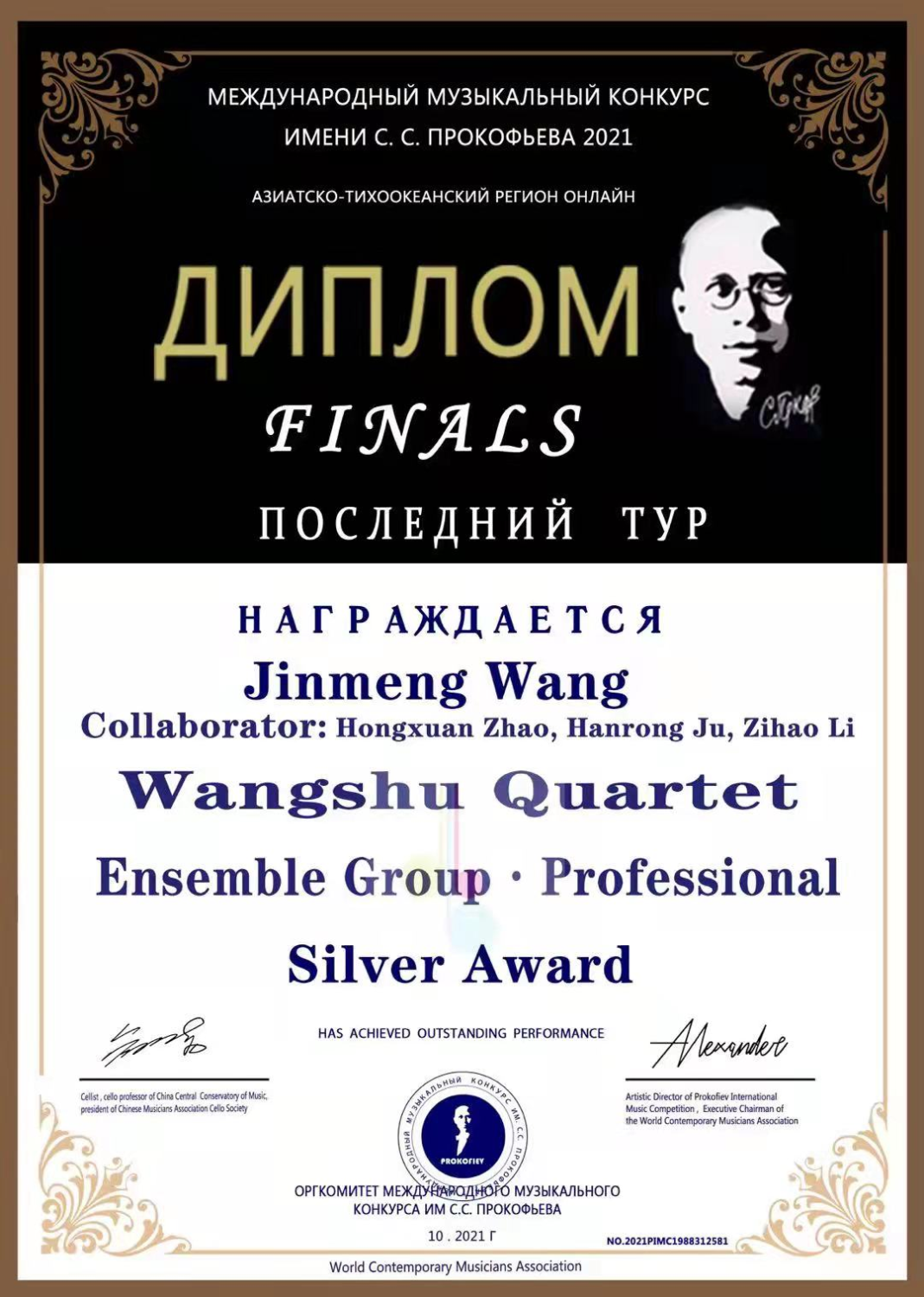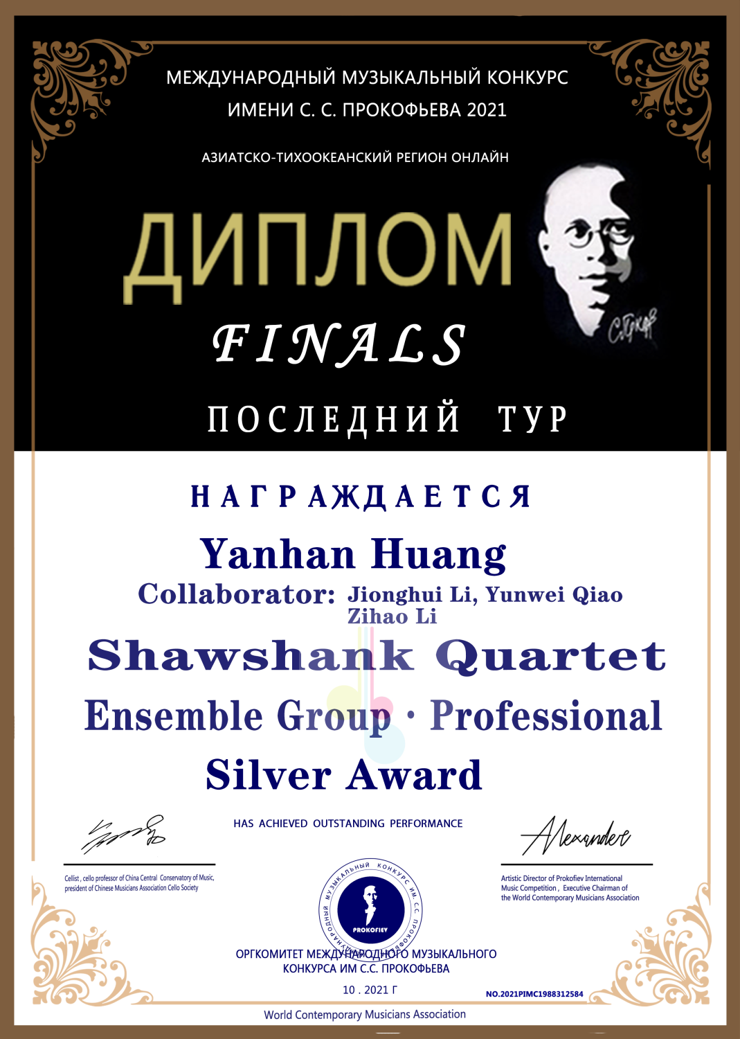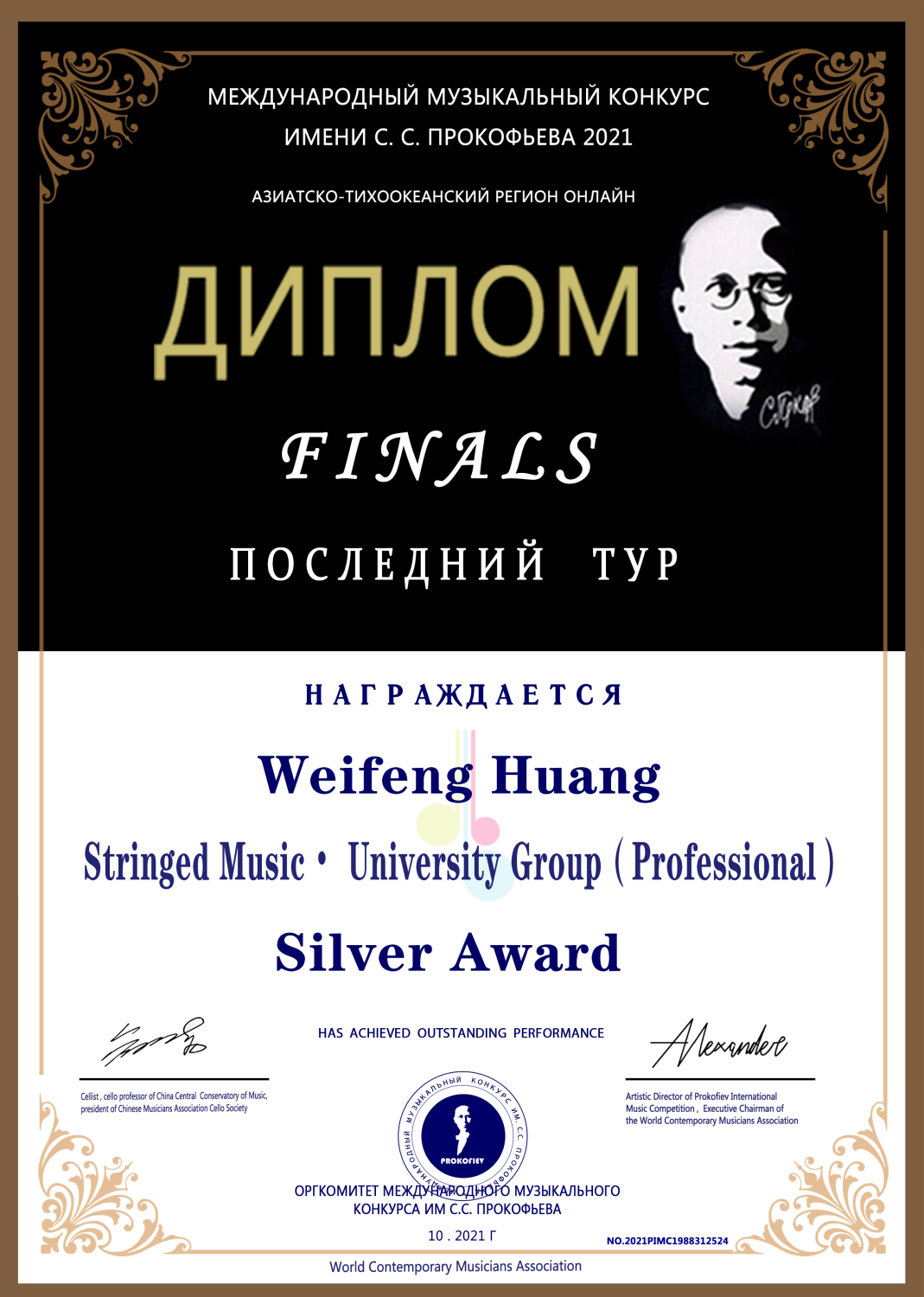2021年获得普罗科菲耶夫大赛低音提琴演奏家组决赛银奖(金奖空缺)。