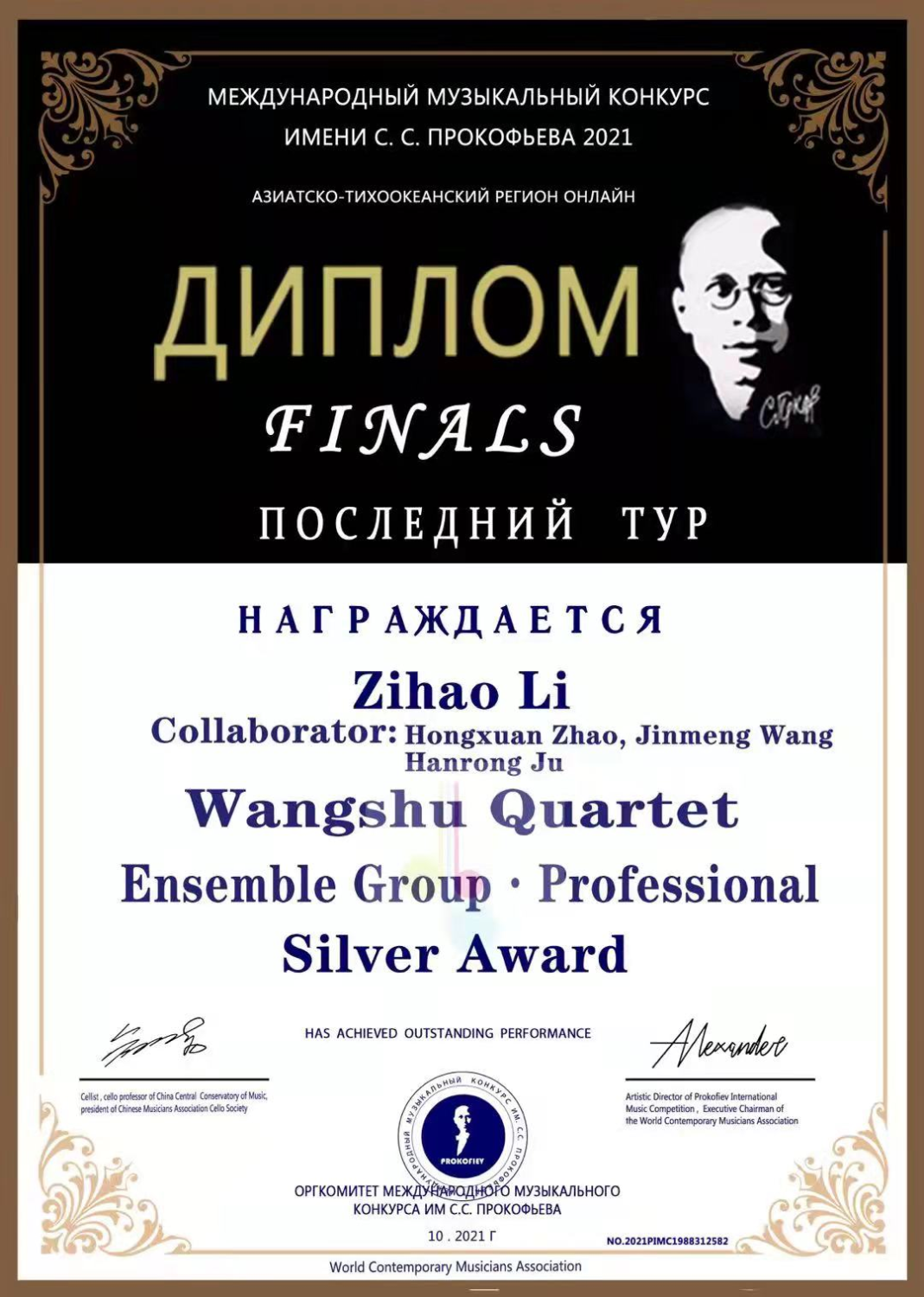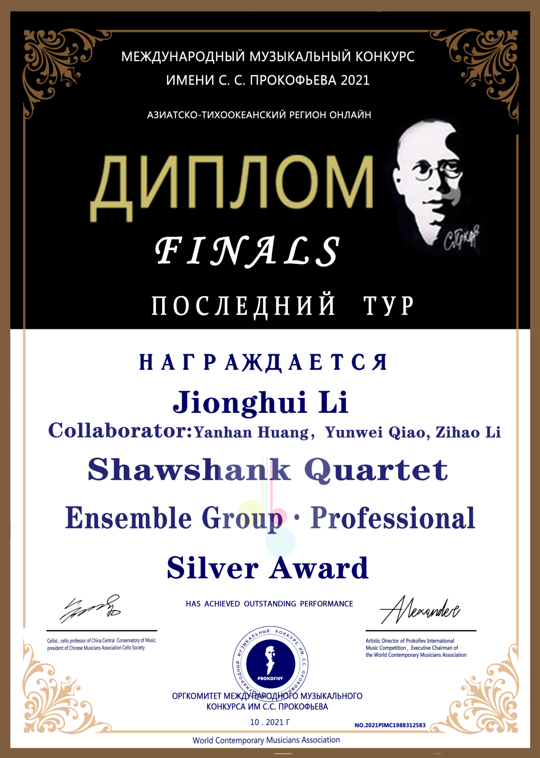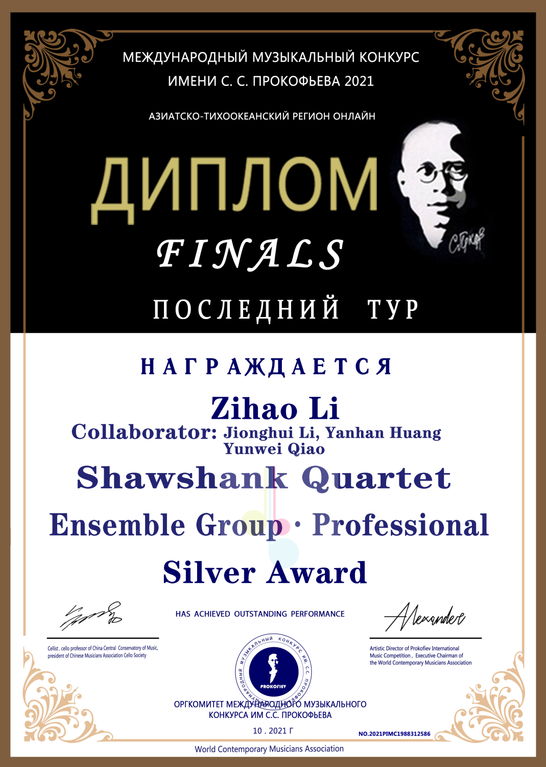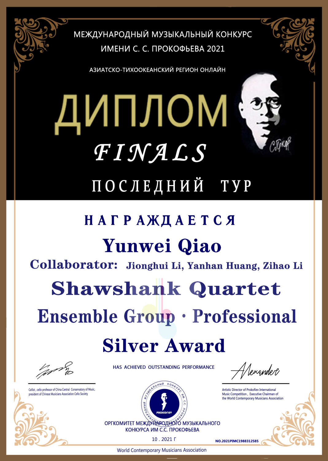 2021年获得普罗科菲耶夫大赛低音提琴演奏家组决赛银奖(金奖空缺)。