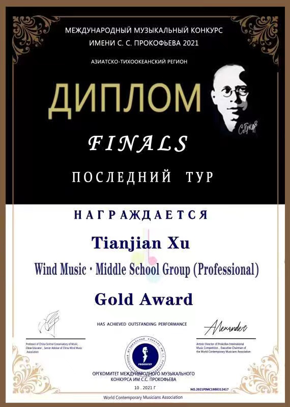 2021年,夺得2021普罗科菲耶夫国际管弦乐大赛专业大学组金奖。