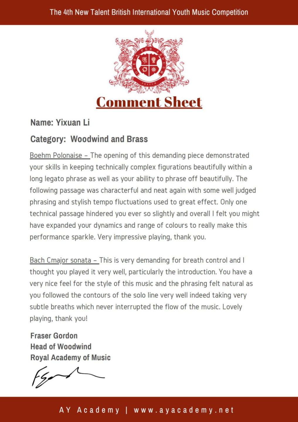 在9月19日结束的2021年第四届英国新菁英国际青少年音乐大赛(New Talent British International Youth Music Competition)评选中,best365初二年级长笛专业李奕萱同学(指导老师:邓甍教授)经过激烈的竞逐,获得木管铜管12-15岁专业组第一名的佳绩。
