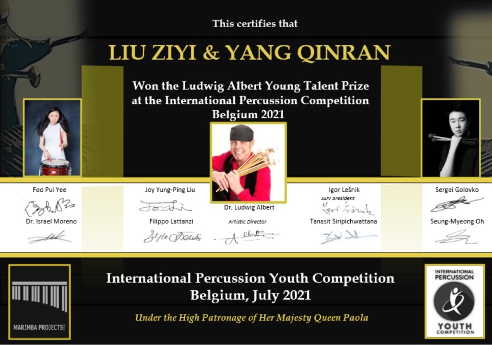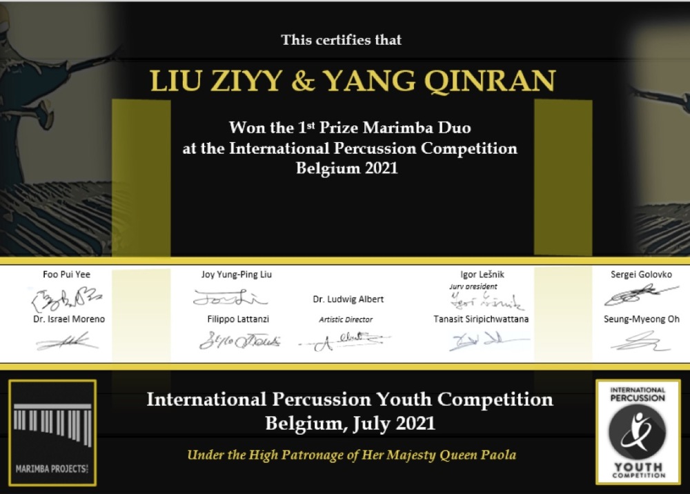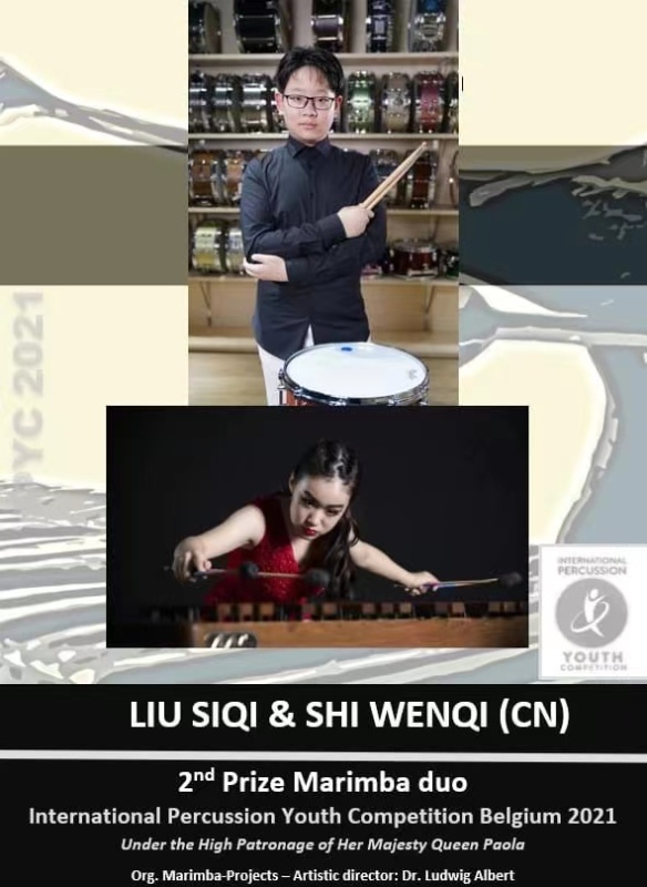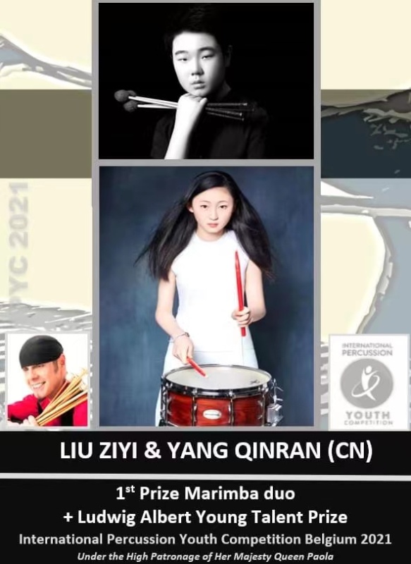 在刚刚落幕的比利时2021年国际青年打击乐比赛中(INTERNATIONAL PERCUSSION YOUTH COMPETITION 2021 BELGIUM),best365中国官方网站附中四名西洋打击专业学生经过激烈角逐,脱颖而出,取得优异成绩。附中高一年级学生刘子一与初三年级学生杨钦然获得2021 IPYCB室内乐马林巴重奏专业组一等奖及青年天才奖(指导教师:张景丽副教授),初二年级学生刘思琪与史文奇获得2021 IPYCB室内乐马林巴重奏专业组二等奖(指导教师:张景丽副教授)。