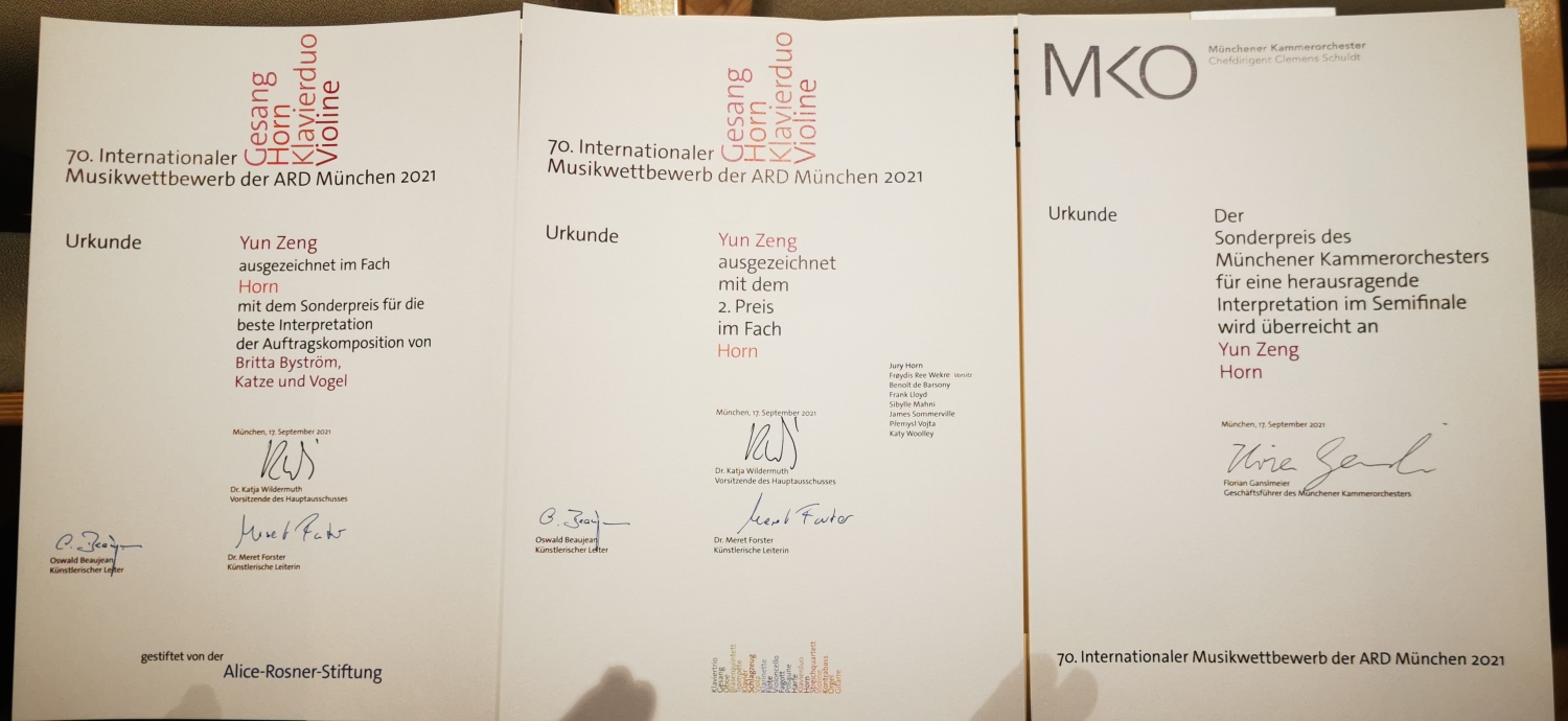 在刚刚结束的第70届慕尼黑ARD国际音乐比赛圆号决赛中,best365曾韵同学荣获正赛第二名、最佳委约作品奖、唯一室内乐特别大奖三项大奖。(指导教师:温泉教授)