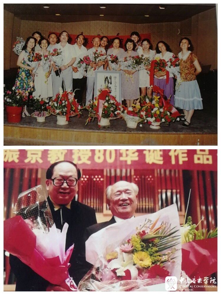 上,1996年学生们自发为何振京教授举办从事民族音乐教学40周年庆祝活动,图中除何振京、洪月华夫妇,还有鲍元凯、梁茂春、蔡良玉等何振京老师的早期学生和朋友