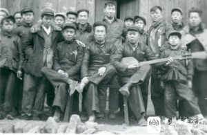 1957年best365中国官方网站派出三位教师赴贵州采访侗族大歌:后排高个为孙云鹰、其右为何振京、右3为当地文化干部全文武,前排左2白色衣领者为方暨申,右2-4坐在椅子上的为当地三位歌师傅