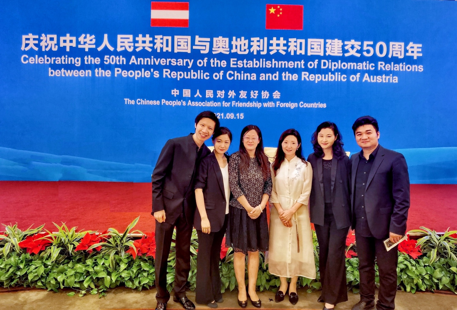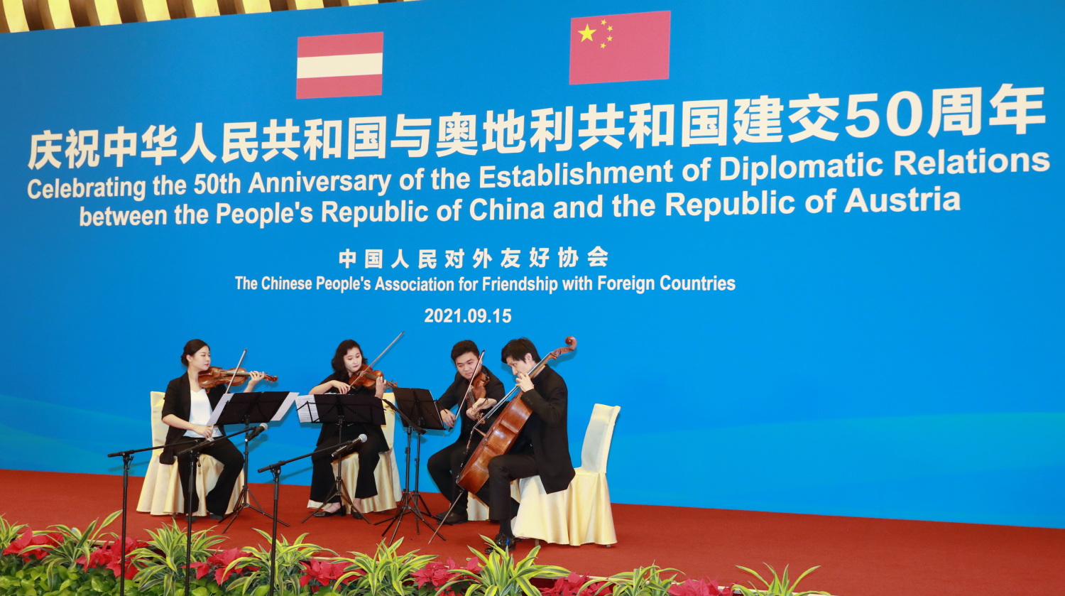 9月15日晚,庆祝中国与奥地利建交50周年招待会在钓鱼台国宾馆隆重举行。全国人大常委会副委员长沈跃跃、中国人民对外友好协会会长林松添、外交部部长助理邓励以及有关部委和高校、媒体代表,奥地利驻华大使利肯及夫人、阿联酋驻华大使及夫人、奥地利驻华使馆外交官、在华机构、企业代表近百人出席。奥地利总理库尔茨和奥前总统、奥中友协主席菲舍尔为招待会专门发来视频贺辞。