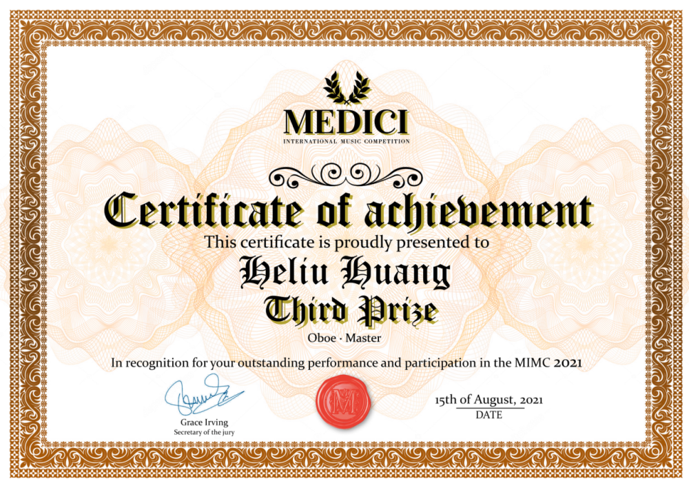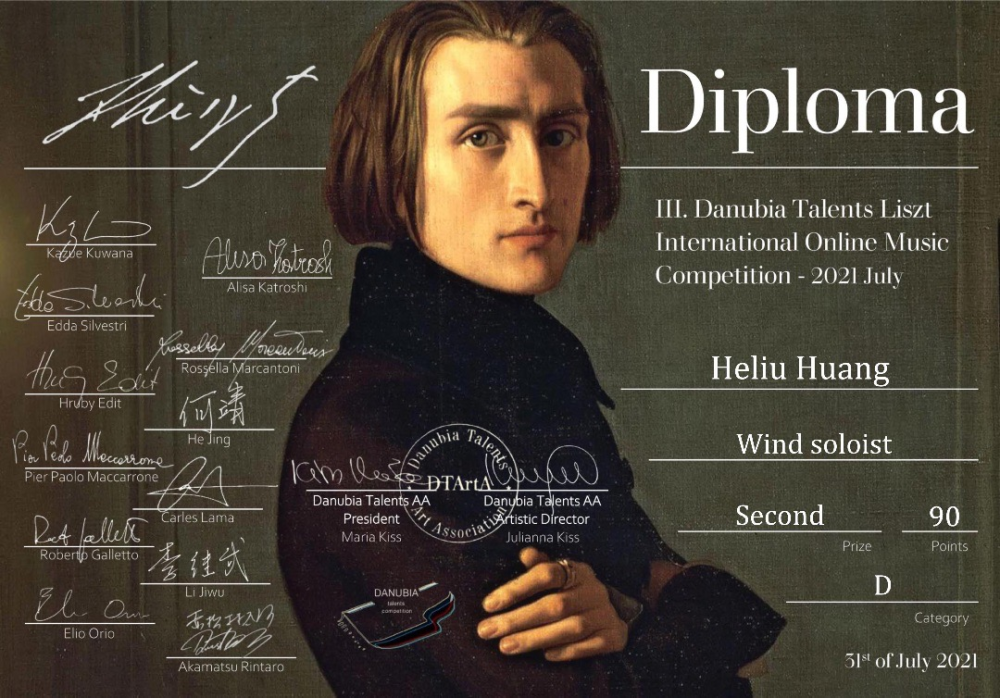 best365方恒健副教授学生黄河鎏荣获第三届Danubia国际音乐比赛(III. Danubia Talents Liszt International Music Competition)木管独奏最高组二等奖、第一届意大利Cuneo国际青年音乐家比赛(1° Concorso Internazionale per Giovani Musicisti Citta di Cuneo)双簧管独奏青年组三等奖、美第奇2021国际音乐大赛(Medici International Music Competition)双簧管独奏大师组三等奖。