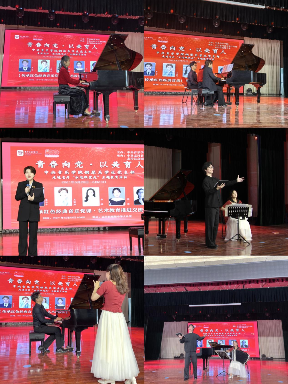 6月22日,钢琴系学生党支部来到志丹县高级中学,以传承红色经典作品为主题、讲述与演奏相互结合的方式,为师生带来了一堂精彩的音乐党课。志丹县县委宣传部及教育局领导、志丹县高级中学校长出席,志丹县各级单位党员、音乐教师及高级中学学生约600人聆听了此次音乐党课。