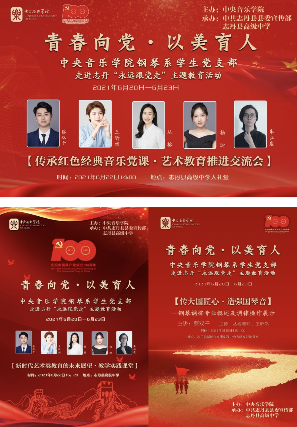 为庆祝中国共产党成立一百周年,深入推进党史的学习教育,增强我系学生党员的责任感与使命感,在2021年6月20日至23日,钢琴系学生党支部与陕西省延安市志丹县高中党总支部联合开展了一系列红色“1+1”党建活动,提高志丹地区基层群众音乐素养。