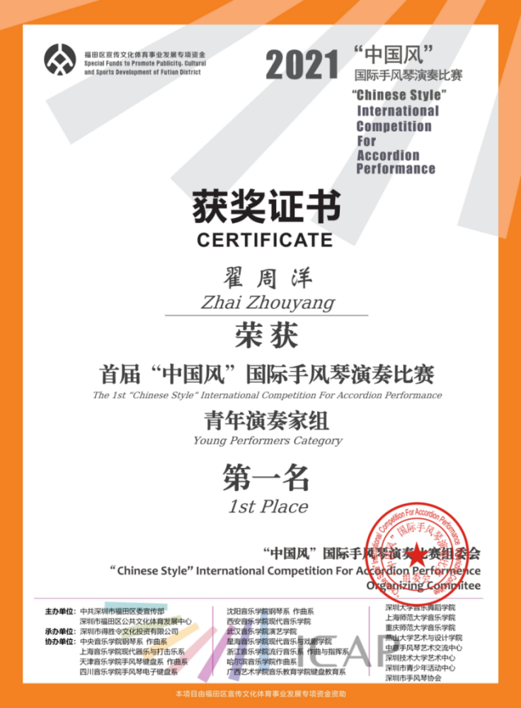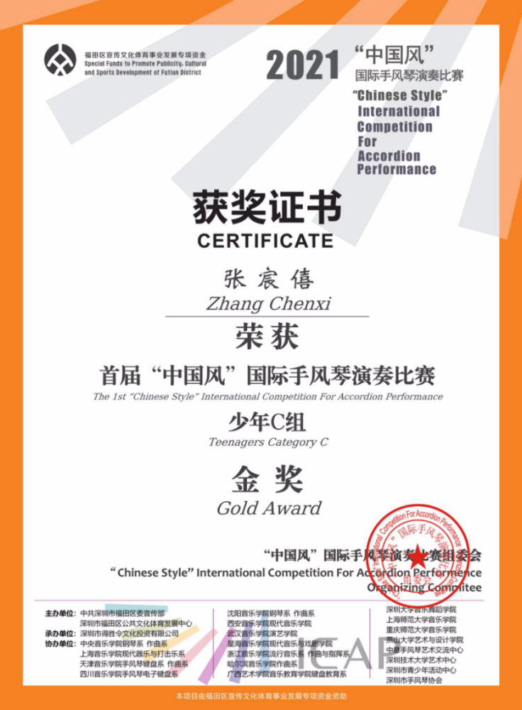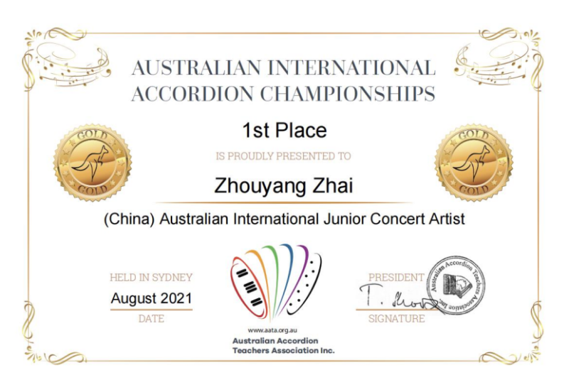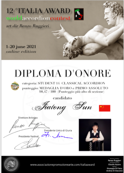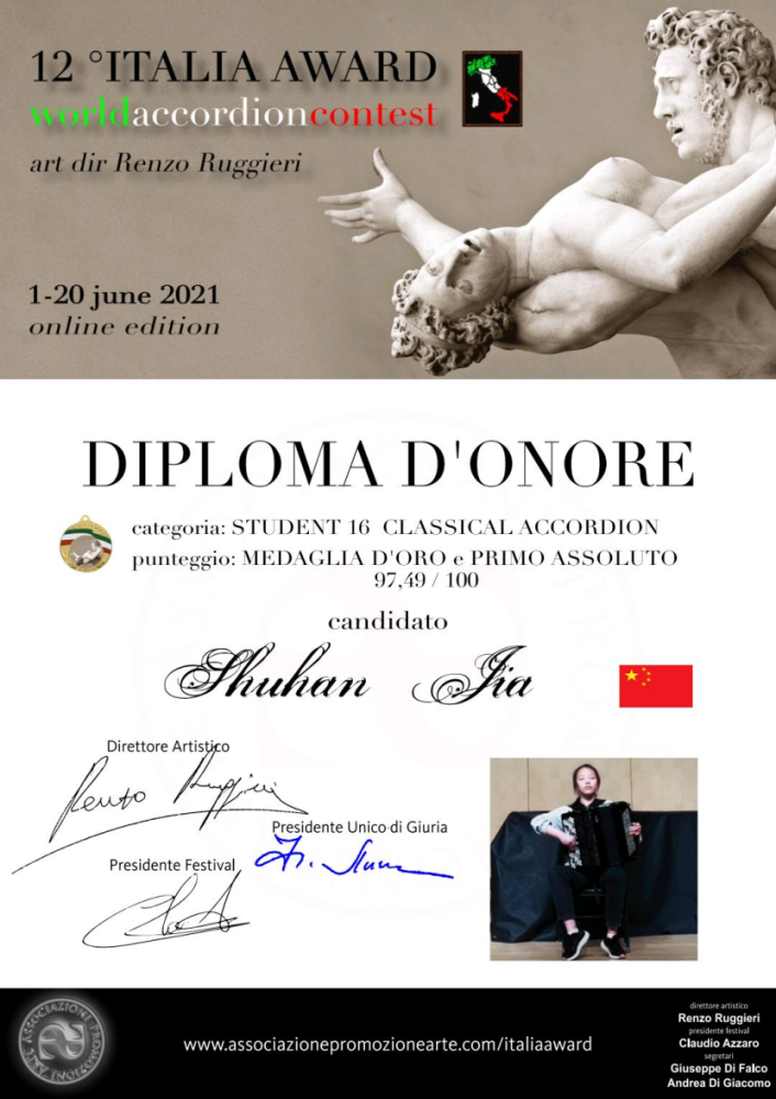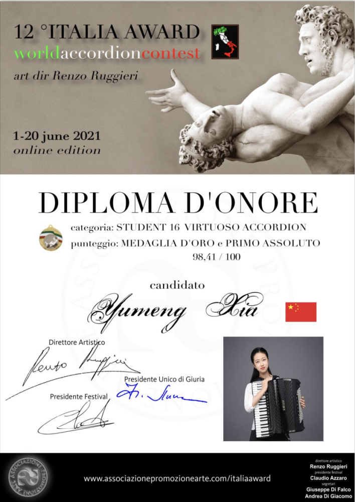 另外,在上学期期末六月份举办的第十二届“意大利奖”世界手风琴比赛(12th Italia Award World Accordion Contest)中,附中同学获得多项第一名。