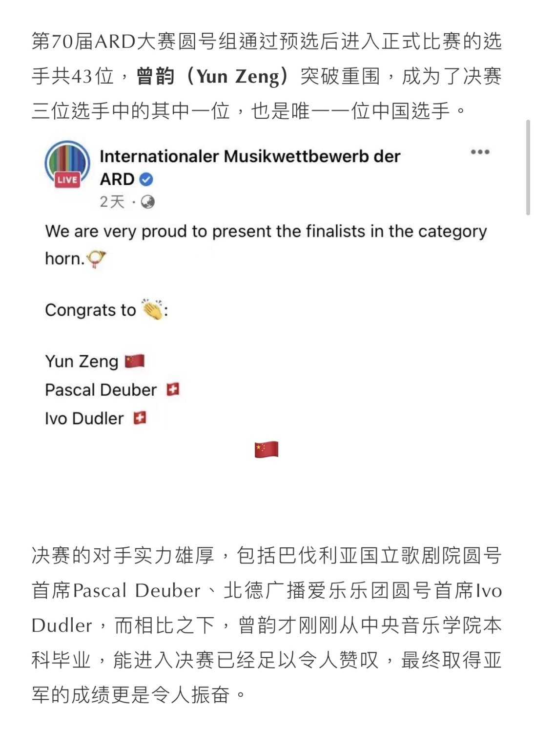 在刚刚结束的第70届慕尼黑ARD国际音乐比赛圆号决赛中,best365曾韵同学突破重围,获得亚军!(指导教师:温泉教授)