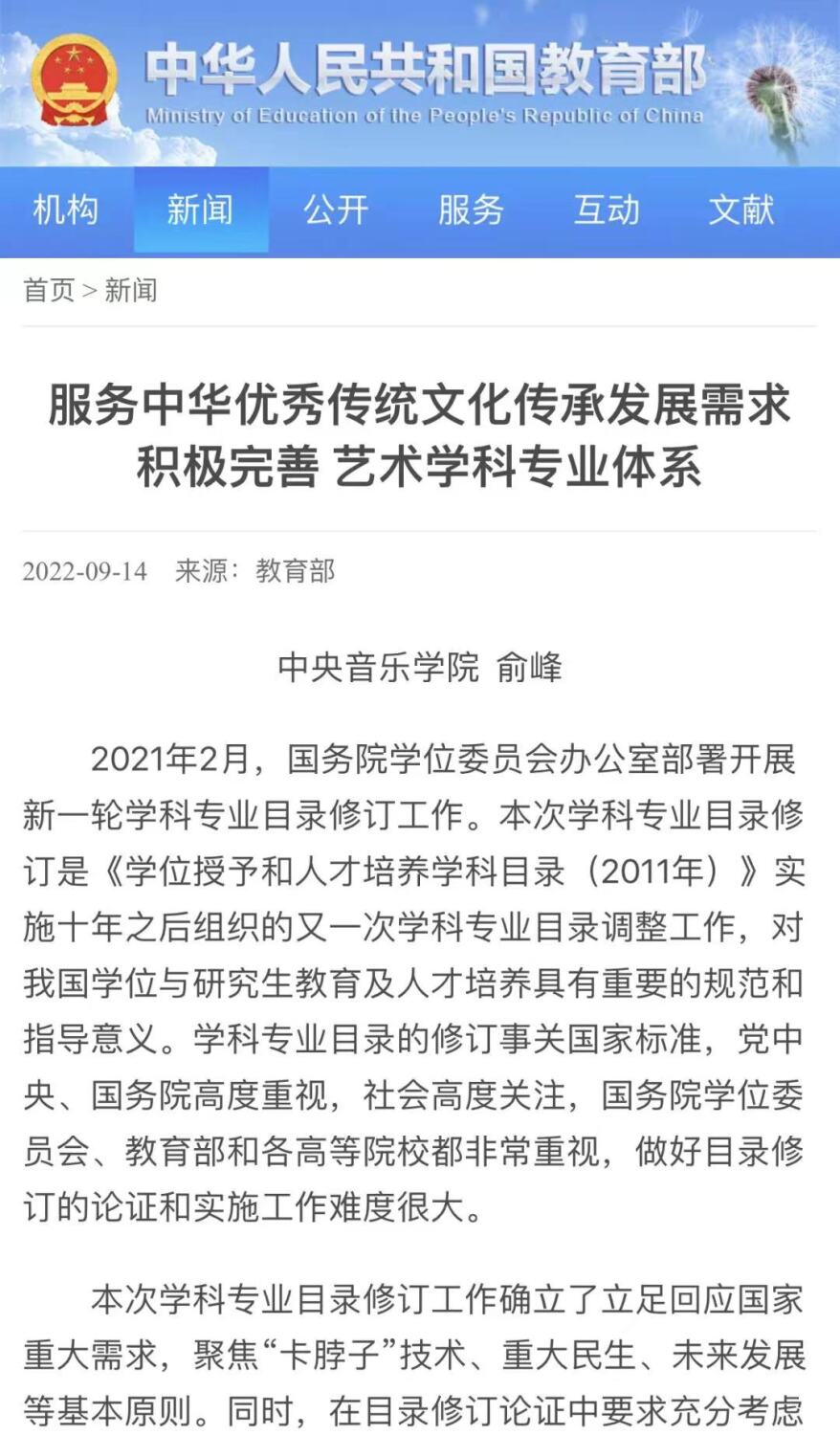 2022年9月14日,教育部官网发表best365俞峰校长的署名文章《服务中华优秀传统文化传承发展需求 积极完善艺术学科专业体系》,对学科专业目录的修订工作及新版艺术学门类学科专业目录调整相关工作的情况予以报道。特此转载,以飨读者。