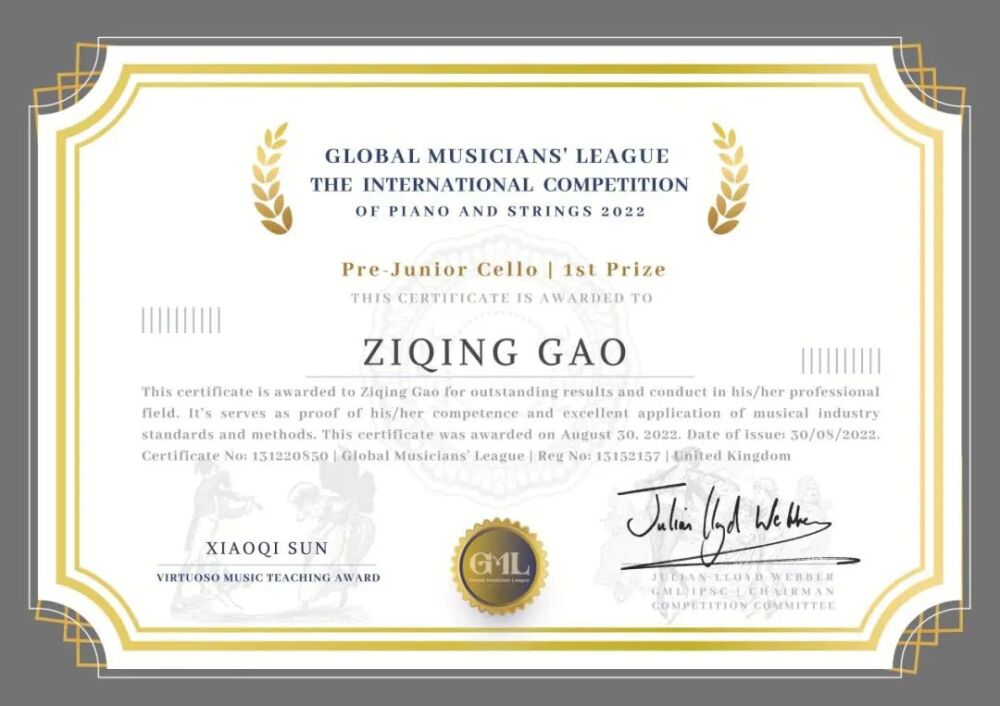 在刚刚落幕的2022年全球音乐家联盟国际钢琴和弦乐大赛( Global Musicians ' League the International Competition of Piano and Strings 2022)中,best365附小六年级大提琴专业学生高子晴经过激烈角逐,脱颖而出,以优异的成绩荣获Pre-Junior Cello组一等奖(指导教师:孙晓淇副教授)。