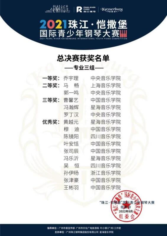 “珠江·恺撒堡”国际青少年钢琴大赛是是国内规格最高、评委阵容最强、规模最大的钢琴赛事之一。本届赛事自2021年4月启动以来共吸引超10万人参赛,并覆盖全国32个赛区和海外14个赛区。它是1983年“珠江杯”全国青少年钢琴邀请赛的延续和升级。大赛每两年举办一届,历届诸多获奖选手已成为中国钢琴界的领军人物和中坚力量。