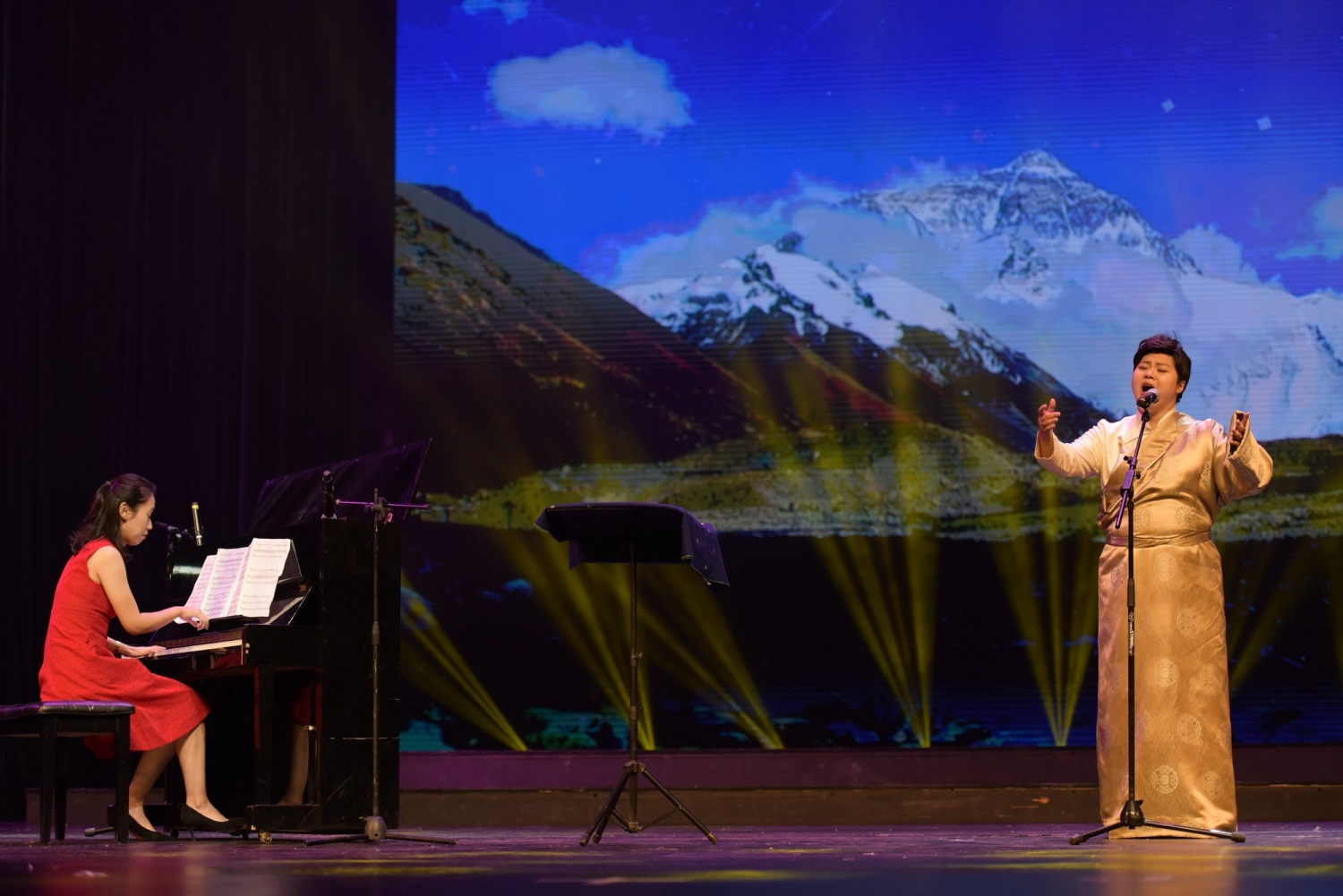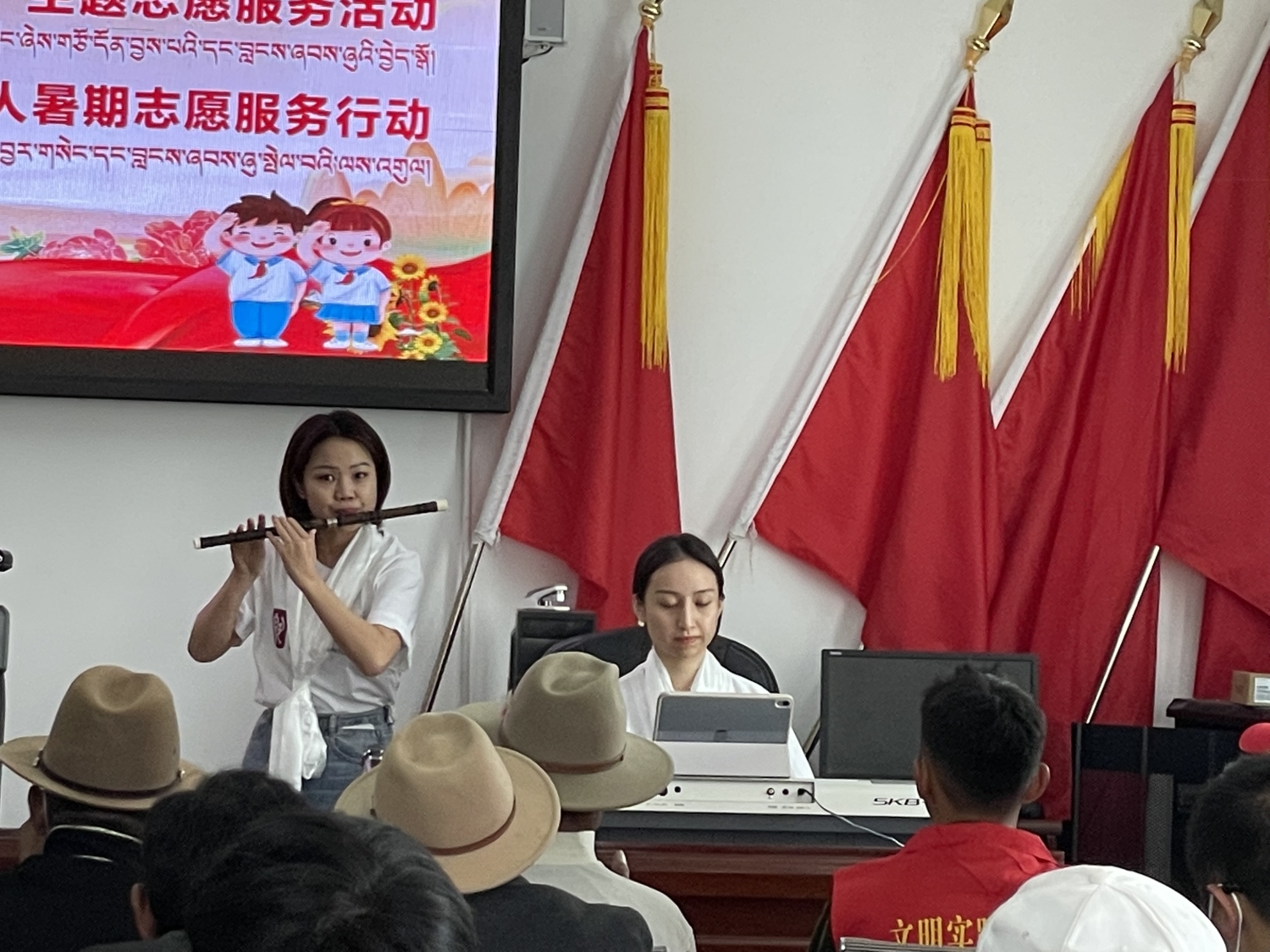 在抵达日喀则当日下午,best365中国官方网站新时代文明实践中心的几位文艺宣讲师不顾旅途劳累,立刻投入日喀则市新时代文明实践“八一”慰问演出的排练及演出工作中。当晚,为现场观众带来了高亢激昂的歌曲《珠穆朗玛》、生机盎然的竹笛独奏曲《春到湘江》以及四手联弹《我爱你,中国》。珠峰少年合唱团带来的一首《万疆》,点燃现场观众对祖国母亲的热爱之情。文艺演出也正式拉开了本次志愿活动的序幕。