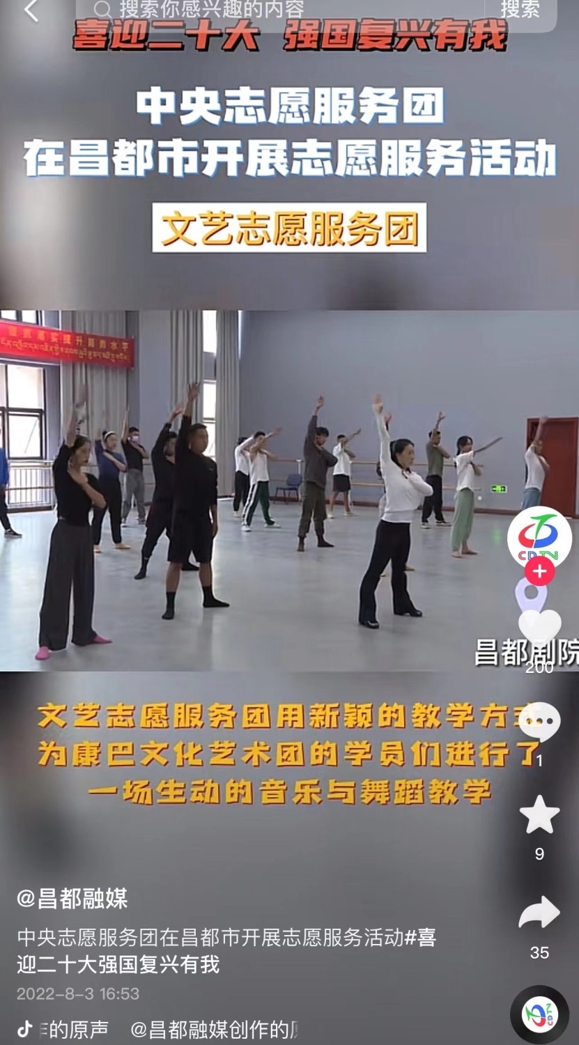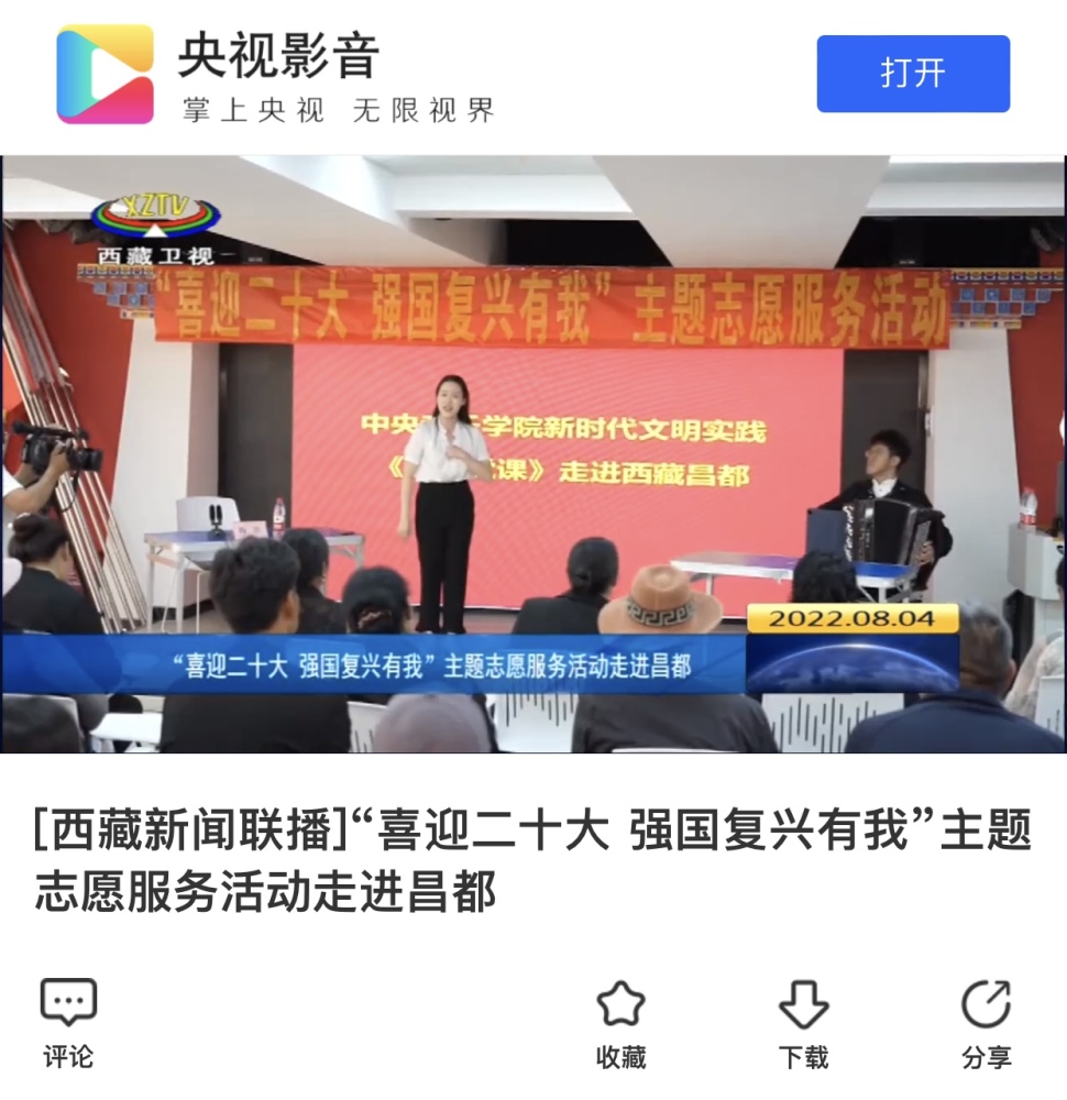 8月1日,“喜迎二十大 强国复兴有我”主题志愿服务活动“永远跟党走”志愿服务团到达昌都,开启西藏志愿服务活动第三站。best365中国官方网站文艺宣讲师团队和学校的优秀师资,联合中央美术学院、北京舞蹈学院的优秀师生深入昌都基层开展新时代文明实践活动,走进当地社区、学校以及文艺团体,给当地人民群众带去丰富多彩的艺术体验,为昌都市艺术教育发展赋能。
