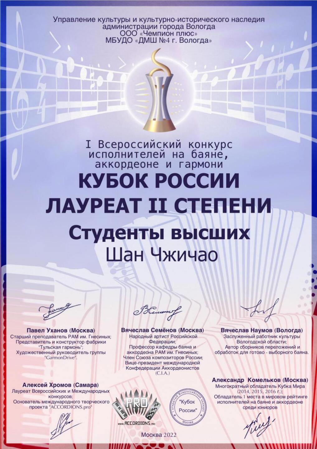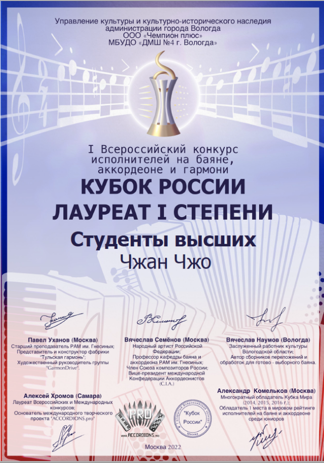 “俄罗斯杯”是俄罗斯手风琴协会、多所音乐院校及演奏家教师们共同举办的大型巴扬及手风琴赛事,由世界手风琴联盟协会、俄罗斯手风琴协会、俄罗斯莫斯科格涅辛国立音乐学院、沃洛格达市政府文化和历史文化遗产司和Trophée Mondial de l'Accordéon 国际手风琴比赛组织举办,已被列入俄罗斯每年重要顶尖赛事之一。