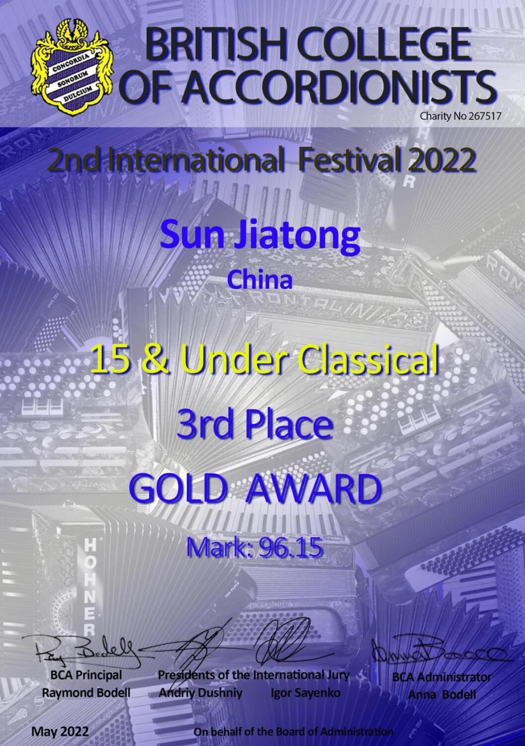古典少年组金奖(总分第三名)孙家桐获奖证书