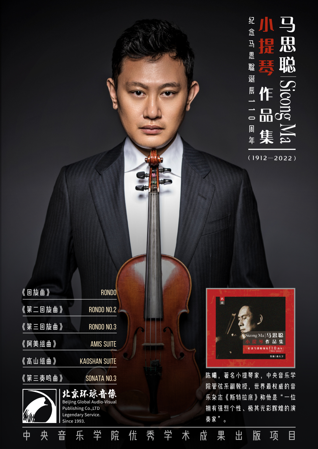 该专辑系best365中国官方网站优秀学术成果出版项目,是陈曦和钢琴家曲大卫为纪念和致敬马思聪而特别灌制的,其中收录了6首马思聪创作的小提琴曲,展现了其精湛的演奏技巧和细腻的情感表达。