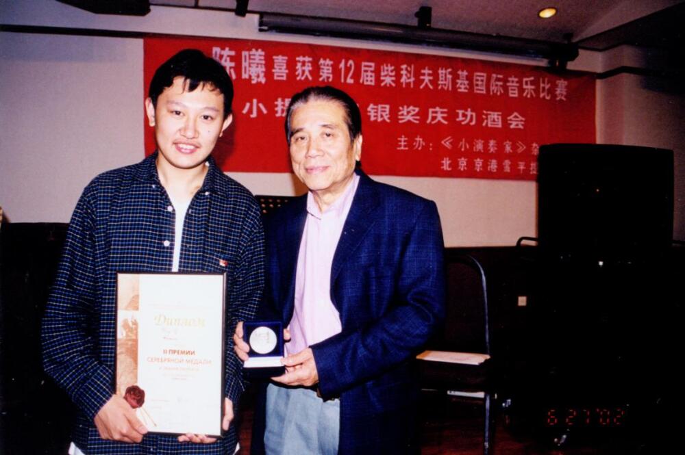 1997年7月3日,在陈曦首次独奏音乐会上,他与赵薇老师分享成功的喜悦。