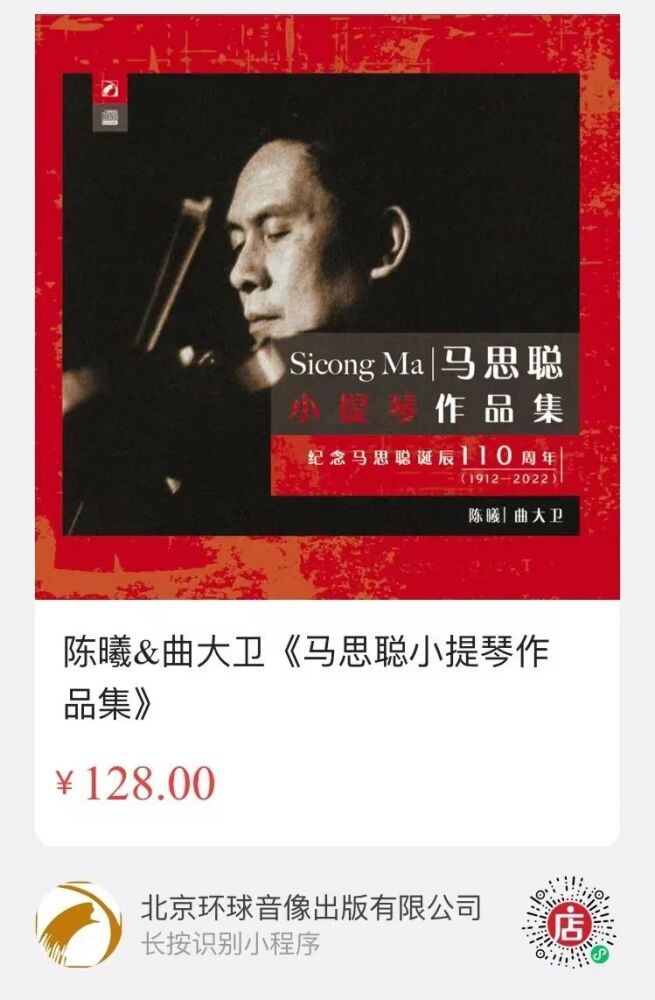 陈曦全新专辑《马思聪小提琴作品集》已上线北京环球音像出版有限公司微店,欢迎大家长按二维码跳转选购!