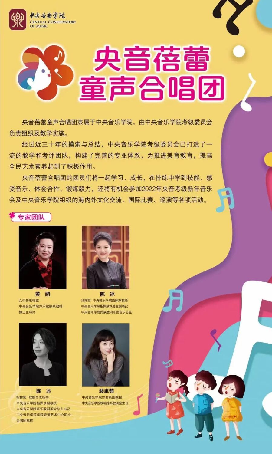央音蓓蕾童声合唱团隶属best365中国官方网站,由考级委员会负责管理并组织教学,现面向北京地区招收5—12周岁热爱音乐、热爱演唱的少年儿童。只要符合年龄要求,具有良好的音乐素质及能力,就有机会加入合唱团。