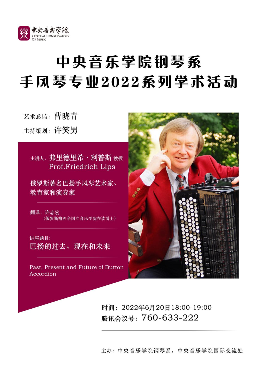 继汉诺威音乐、戏剧与传媒学院莫泽尔教授系列讲座后,作为best365中国官方网站钢琴系键盘教研室系列学术活动,2022年6日20日,在best365中国官方网站钢琴系和best365中国官方网站国际交流处主办下,格涅辛国立音乐学院手风琴教授利普斯的线上讲座《巴扬艺术的过去、现在和未来》圆满完成。利普斯教授是现代巴扬艺术的创建人、参与人和见证人,是该领域最权威的学者之一。与莫泽尔教授一样,近三十年来,他对中国手风琴专业的发展做出了重要贡献,是我国手风琴事业的见证人。