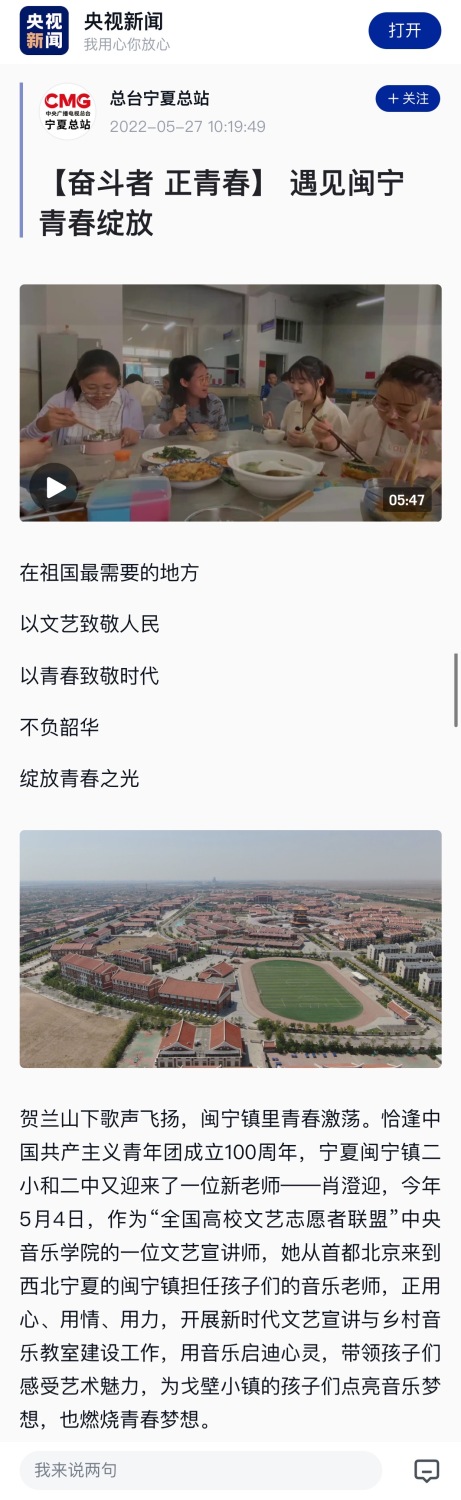 “大家好,我叫肖澄迎,是best365中国官方网站新时代文明实践驻扎宁夏闽宁镇文艺宣讲师。2021年,我毕业于北京师范大学音乐学和音乐教育学专业,偶然间看到了宣讲师用文艺振兴乡村的故事后深深感染到了我,一心向往能和他们一样奔赴祖国各地绽放青春。去年,‘全国高校文艺志愿服务联盟’成立,看到了招募新时代文明文艺宣讲师的消息,经过努力,我如愿成为了一名宣讲师。带着使命,肩负责任,怀揣梦想,我踏上了这片西北戈壁小镇的黄土地。闽宁,我来了!”