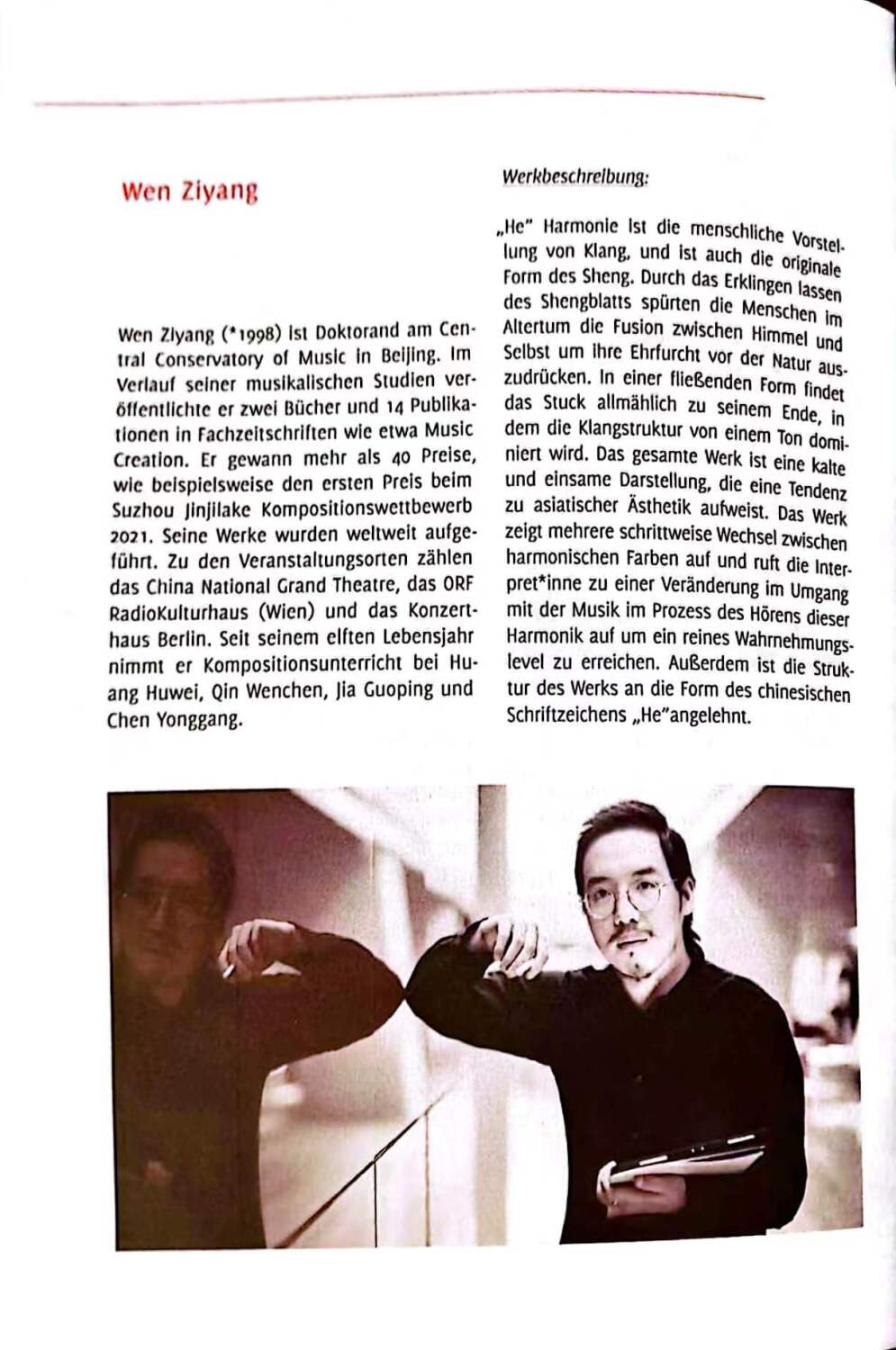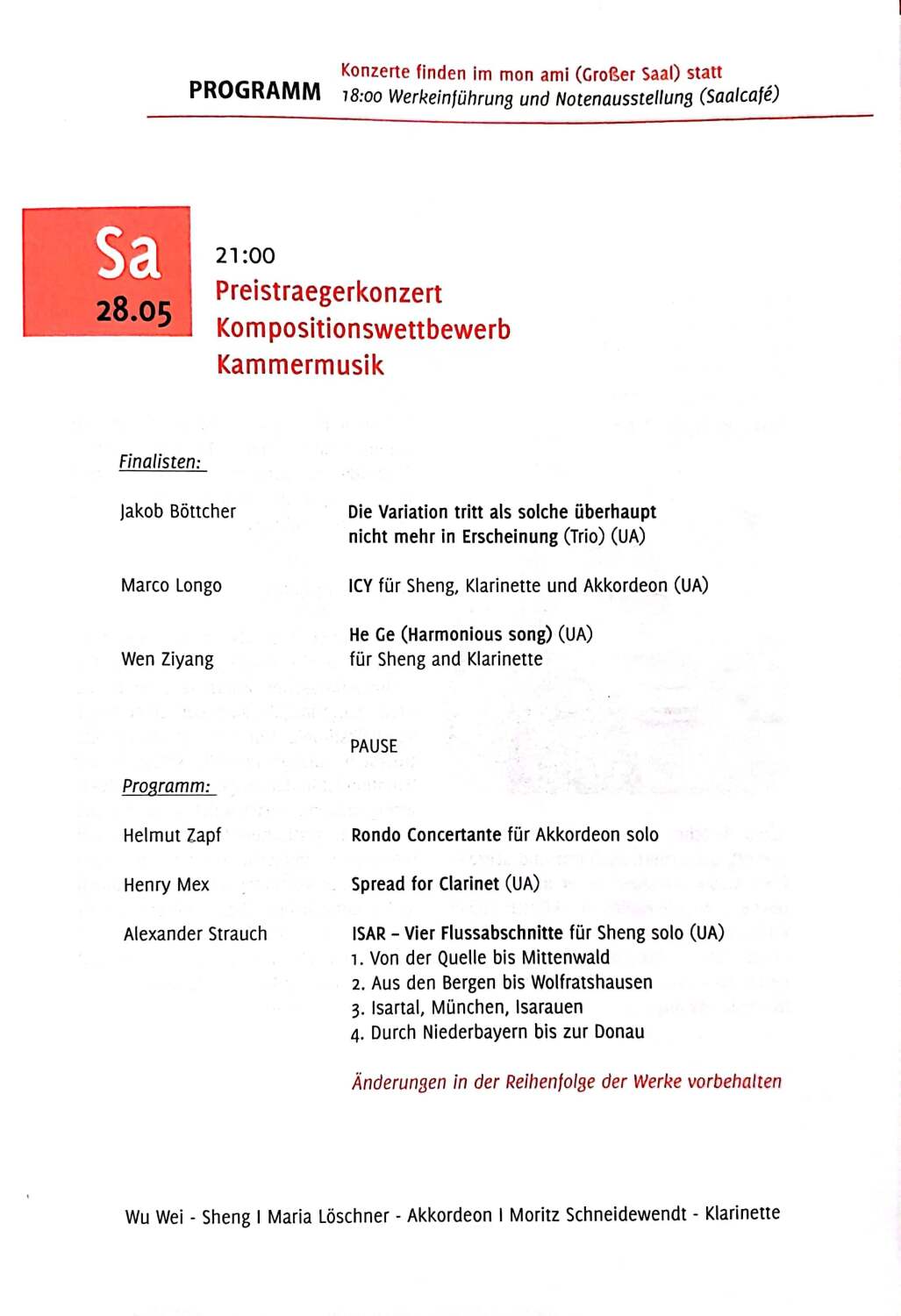 5月28日,魏玛国际作曲比赛室内乐组决赛音乐会在魏玛文化与青少年活动中心举行。著名笙演奏家吴巍与单簧管演奏家Moritz Schneidewendt、手风琴演奏家Maria Löschner现场演奏了三首入围作品。最终经过由英国作曲家、指挥家Gwyn Pritchard、德国作曲家协会图林根州作曲协会主席JohannesK.Hildebrandt、作曲家、柏林艺术学院成员Helmut zapf在内的评委评议,将大奖颁给文子洋同学。此外,经由现场观众投票,文子洋的作品还获得最受观众喜爱奖。