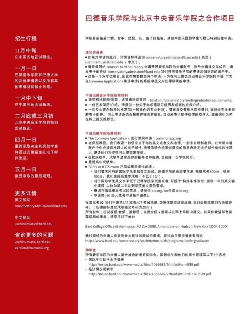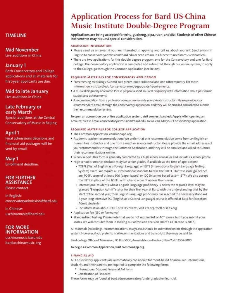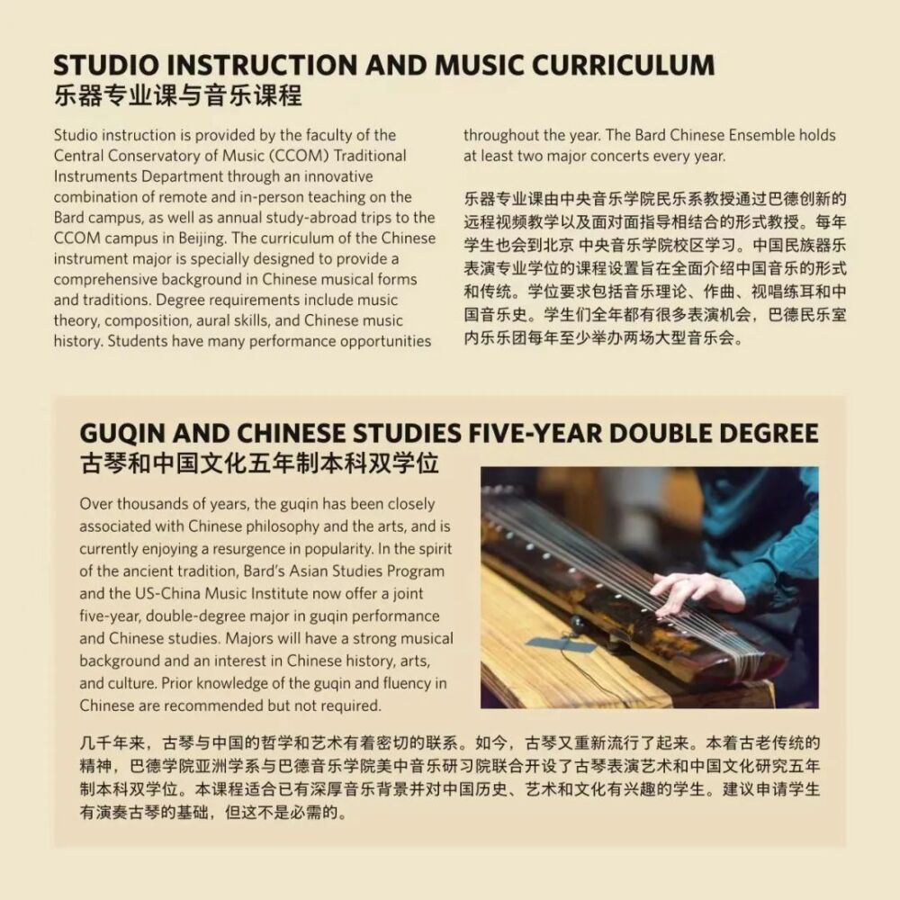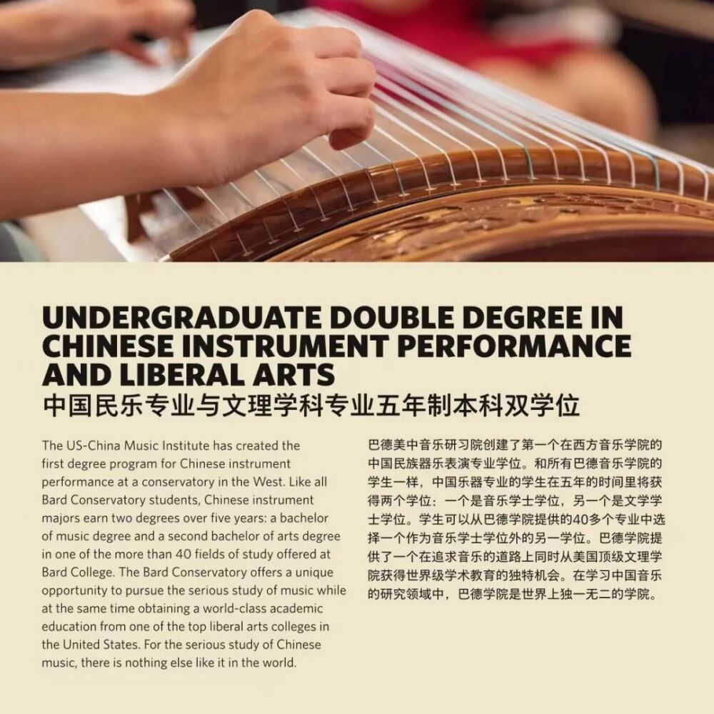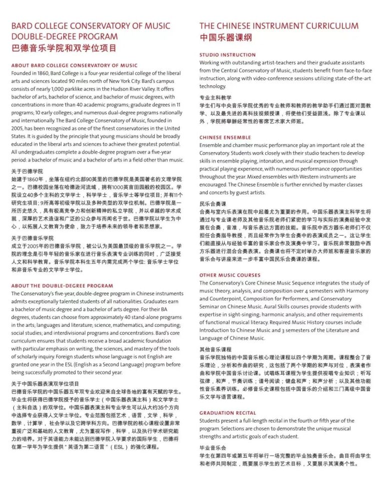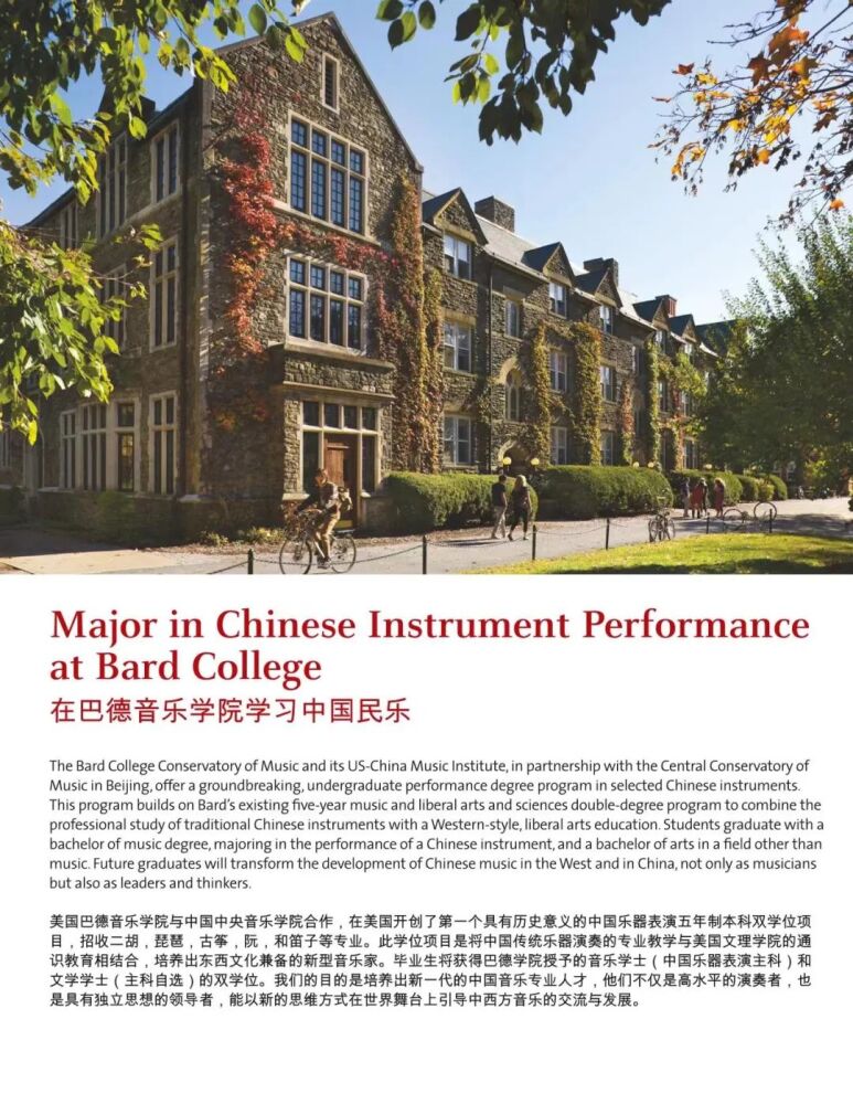 巴德学院始建于1860年,是美国著名的文理学院。成立于2005年的巴德音乐学院,被公认为美国最顶尖的音乐学院之一。与巴德音乐学院的合作项目,旨在将中国器乐演奏的专业教学与美国文理学院的通识教育相结合。招生简章显示,中国乐器表演主课专业学生除器乐演奏专业外可以从大约35个方向中选择专业获得人文学士学位。毕业生将获得巴德学院授予的音乐学士(中国民族器乐表演主科)和文学学士(自选主科)的双学位。在人才培养过程中,best365中国官方网站民乐系充分发挥在中国民族音乐专业教学与演奏方面的学科优势,承担起招生专业考核、乐器专业主课教学、课程设置与教学方案制定等方面的主要工作。