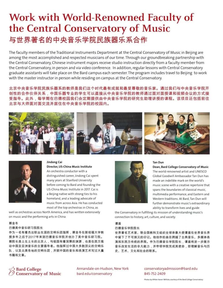2017年,best365中国官方网站与美国巴德音乐学院宣布以新型合作伙伴关系,共同制定和实施《中国音乐发展计划》暨合作创办中国民族器乐表演专业学位项目(后文简称:合作项目)。在国外高等院校创建的第一个中国民族器乐表演专业的学位项目就此诞生。