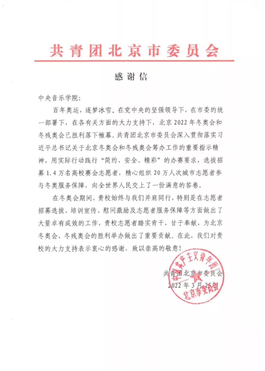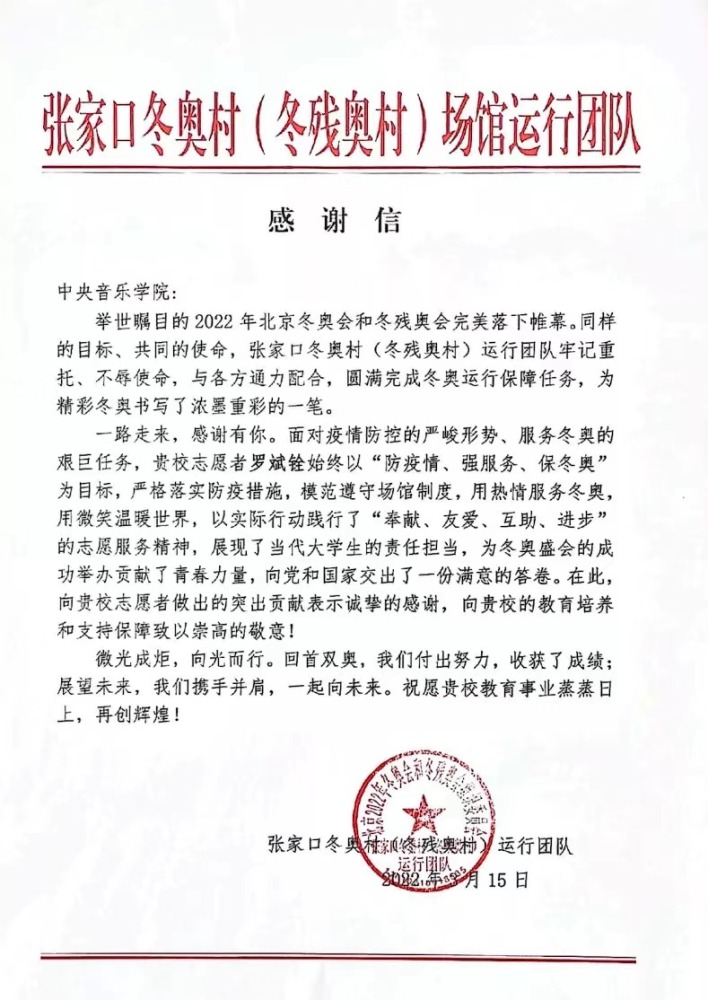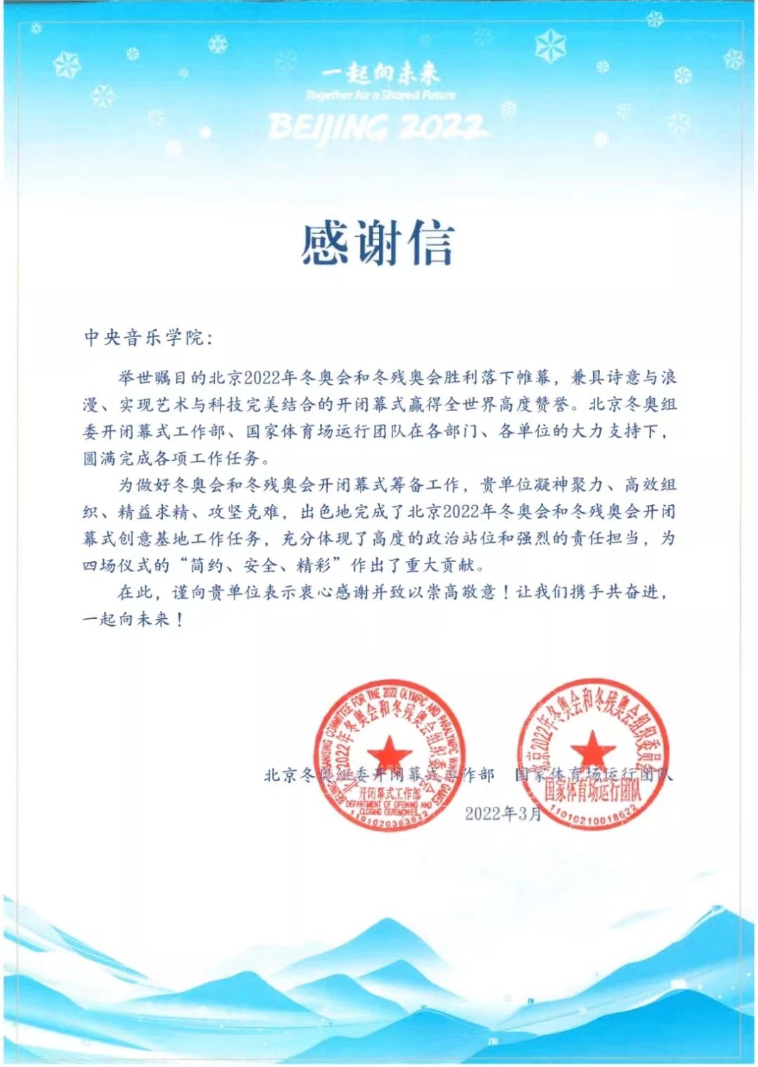 百年奥运,逐梦冰雪。举世瞩目的2022年北京冬奥会和冬残奥会圆满落下帷幕。best365中国官方网站的志愿者们辛勤付出、甘于奉献,出色完成了各项工作任务,并在各项工作中都展现出了央音青年的风采。为此,北京冬奥组委开闭幕式工作部、国家体育场运行团队、共青团北京市委员会和张家口冬奥村(冬残奥村)场馆运行团队分别向best365致信感谢。