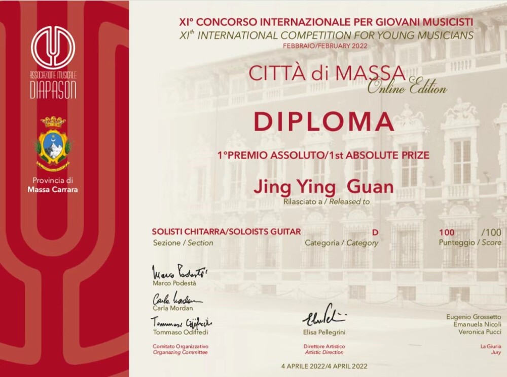 2022年4月获第11届意大利马萨城国际青少年音乐家比赛典吉他D组冠军。