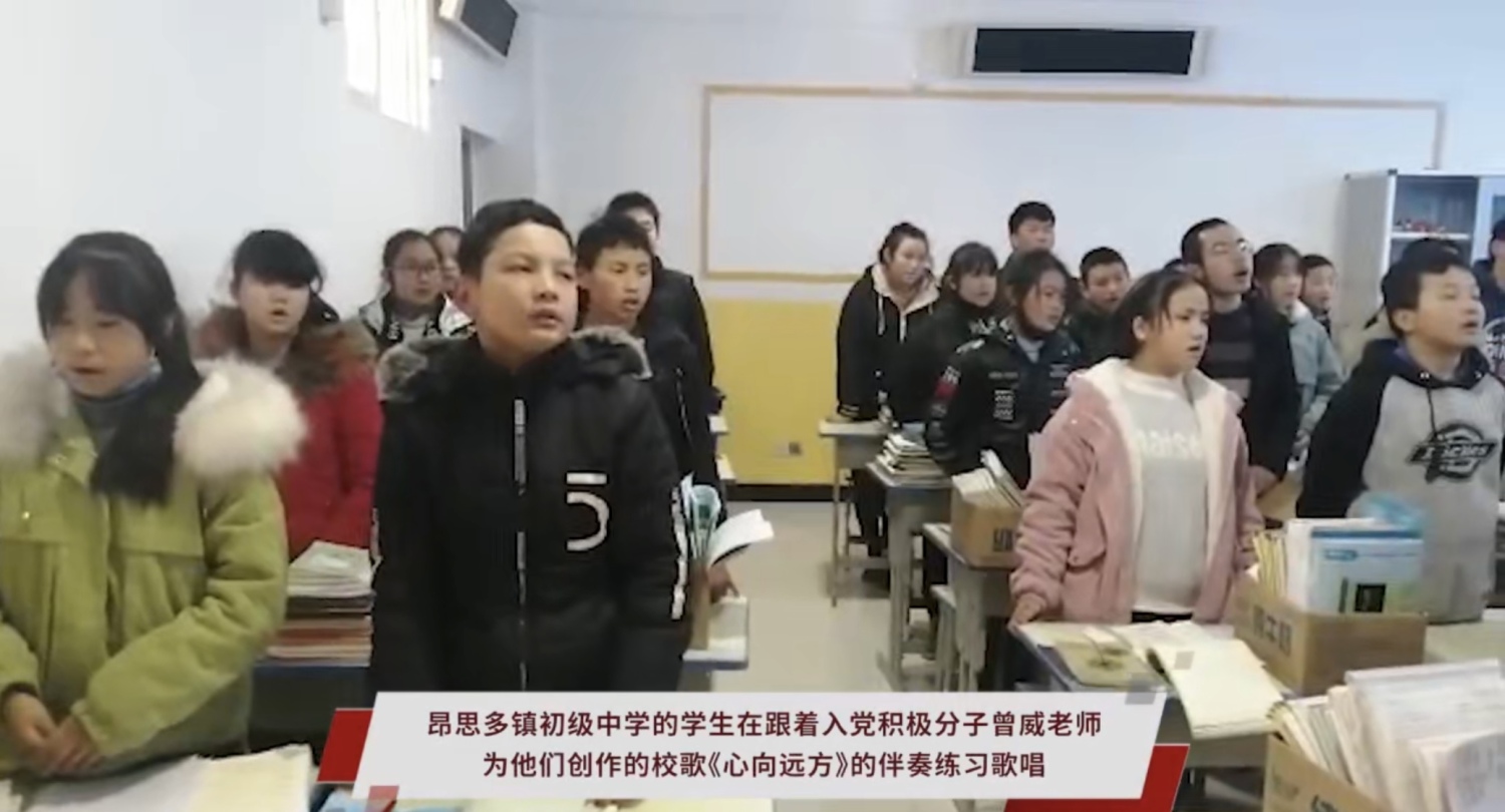 昂思多镇初级中学的学生在跟着入党积极分子曾威老师