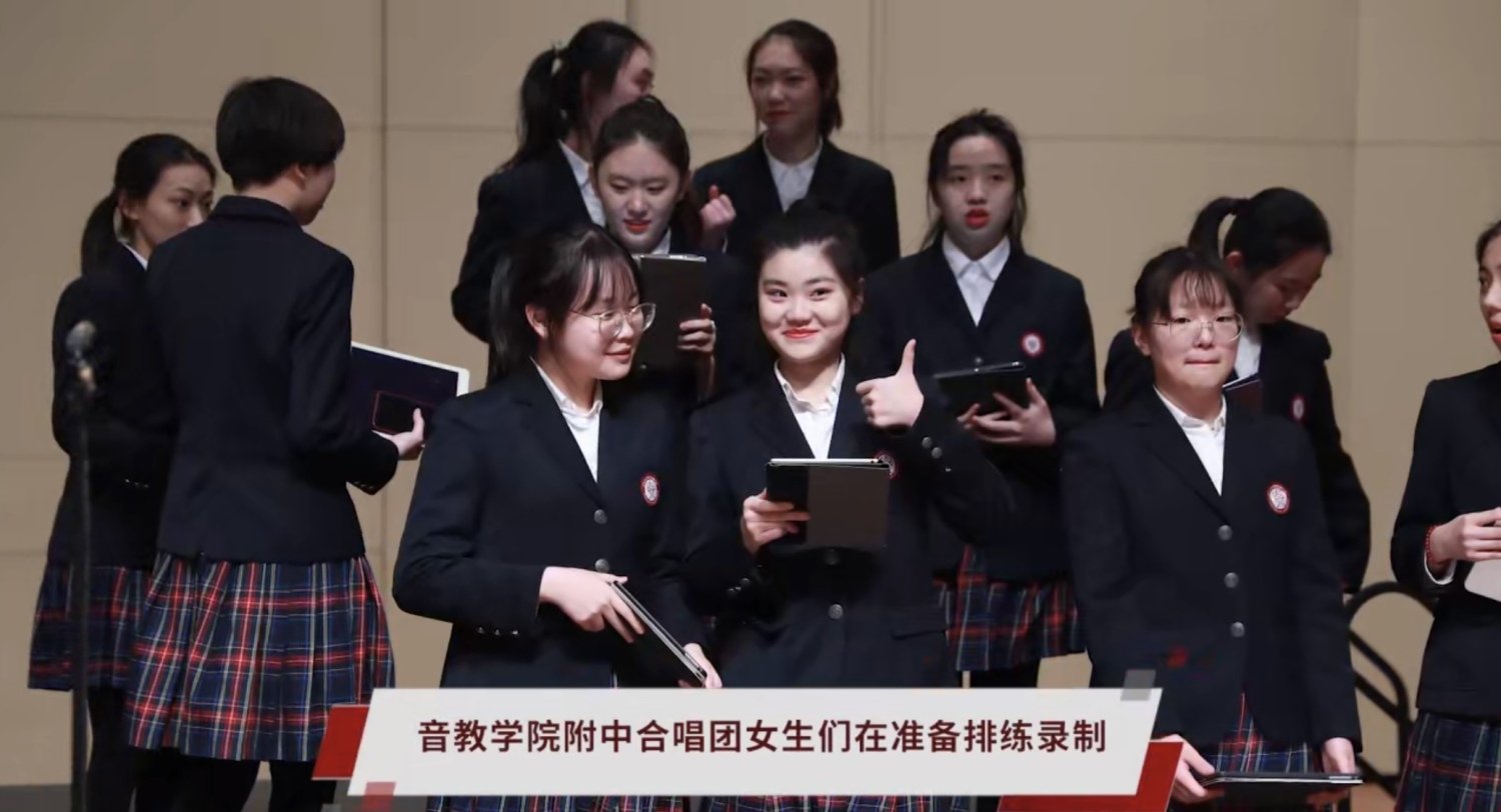 音教学院附中合唱团在准备排练录制