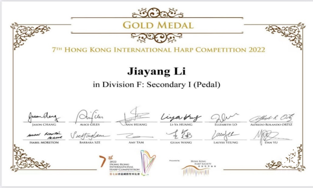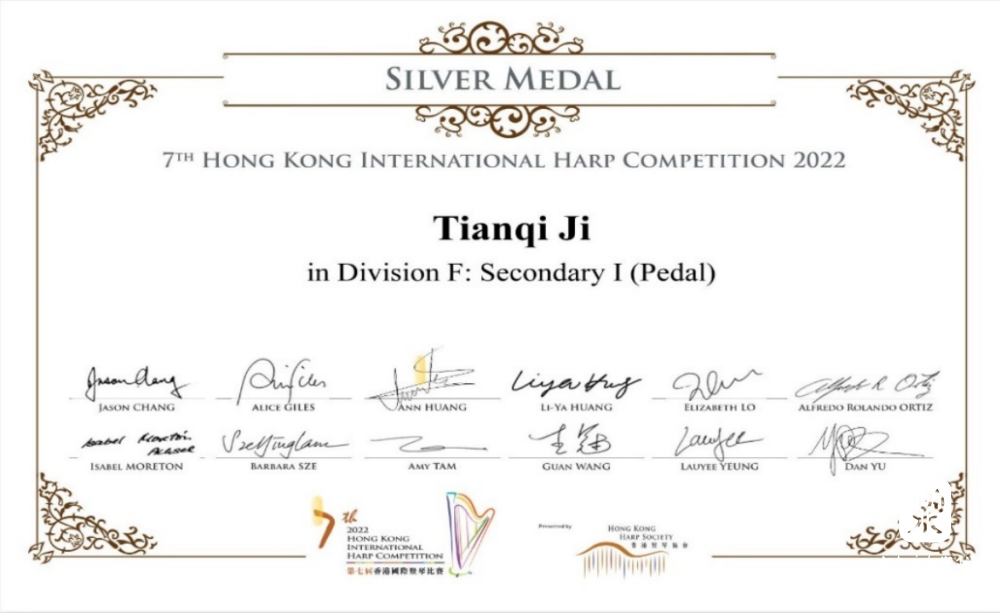 在刚刚落幕的第七届香港国际竖琴比赛(7th 2022 Hong Kong International Harp Competition )中,经过激烈的角逐,best365附中初二年级学生李佳阳获得F组金奖,初三年级学生纪天奇获得F组银奖,附小四年级学生刘熙语格获得D组银奖。
