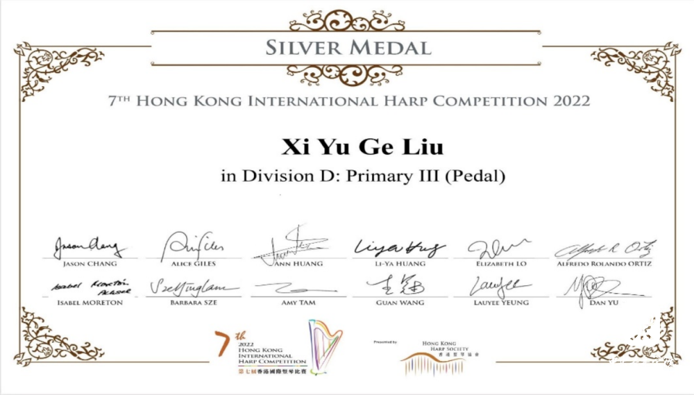 2021年获第四届新加坡国际音乐节西洋乐大赛竖琴专业少年组第一名。