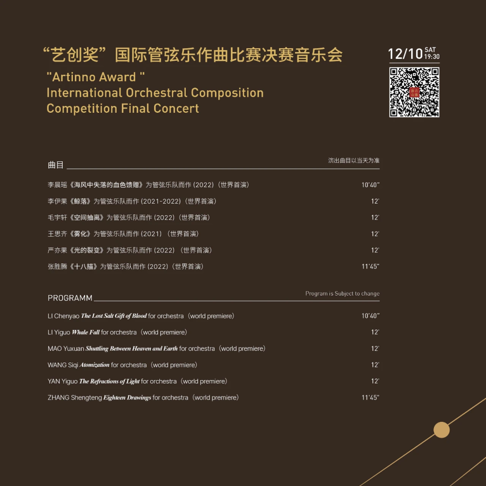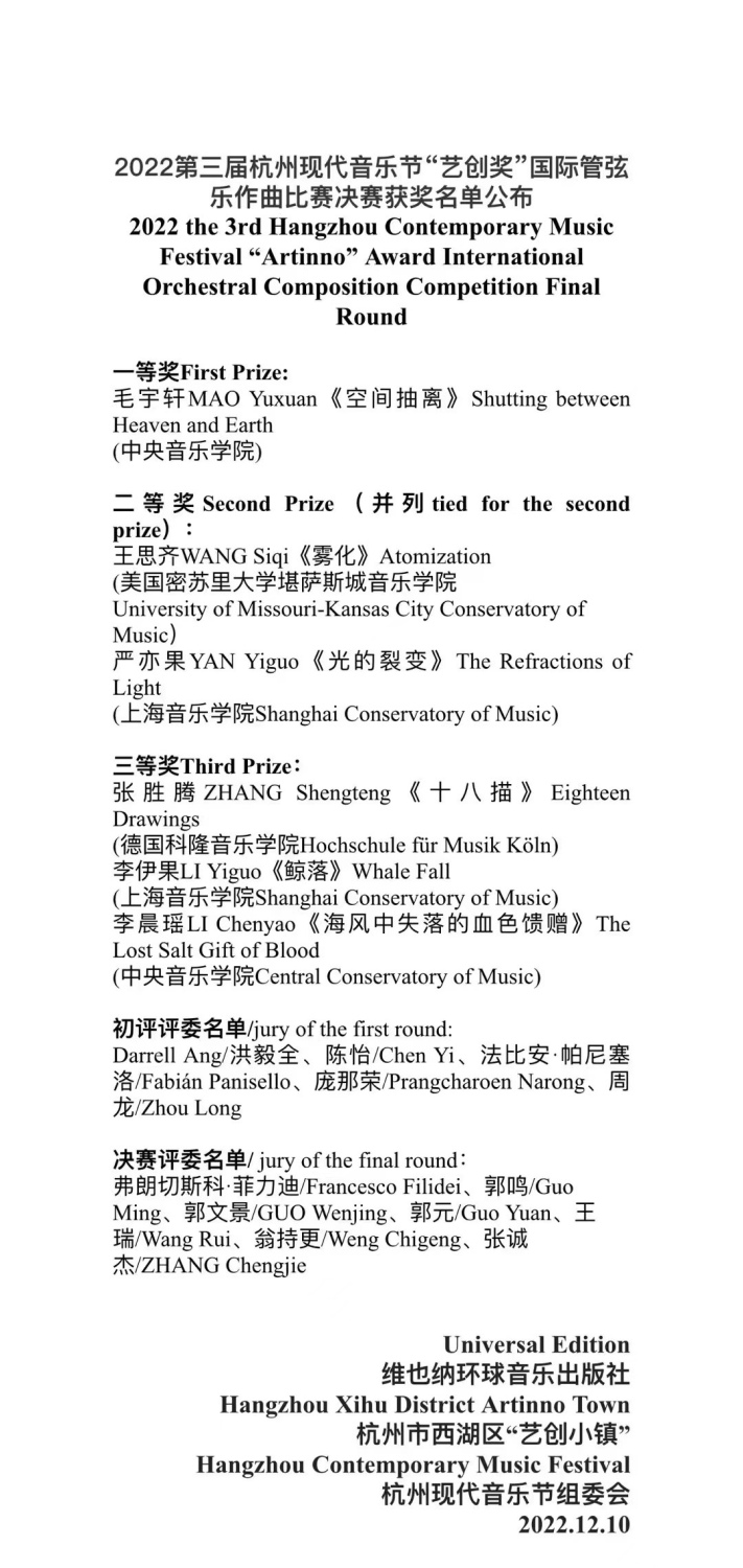 2022年12月10日,第三届杭州现代音乐节的第二天,“艺创奖”国际管弦乐作曲比赛决赛音乐会顺利举行。“艺创奖”作曲比赛自创办以来,已在国内外产生了广泛的影响。本届作曲比赛收到来自全球12个国家及地区的83首参评作品,其中6部作品经过初赛评委遴选入围决赛。由指挥家张诚杰执棒浙江交响乐团进行世界首演,并决出了最终名次。经过评委会的线上打分,最终best365作曲系本科生毛宇轩(指导教师:贾国平教授)的作品《空间抽离》荣获一等奖,博士生李晨瑶(指导教师:贾国平教授)的作品《海风中失落的血色馈赠》荣获三等奖。