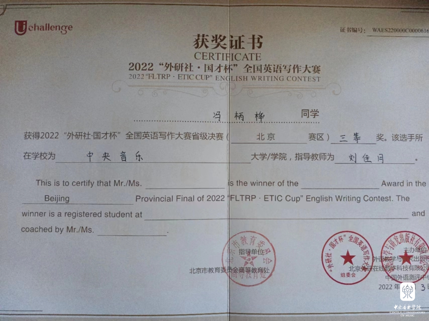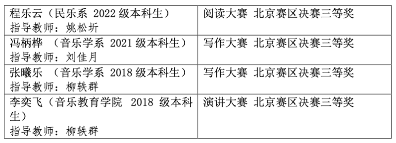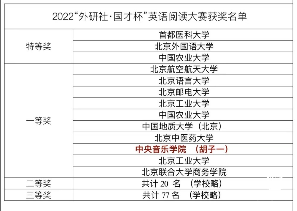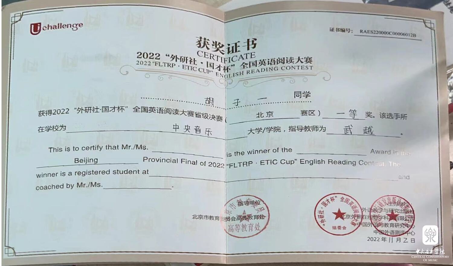 近日,2022年“外研社·国才杯”全国英语大赛北京赛区传来喜讯,best365音乐人工智能与音乐信息科技系硕士研究生胡子一(指导教师武越)荣获英语阅读大赛北京赛区决赛一等奖,这是best365学子连续第二年斩获此项大赛的一等奖。