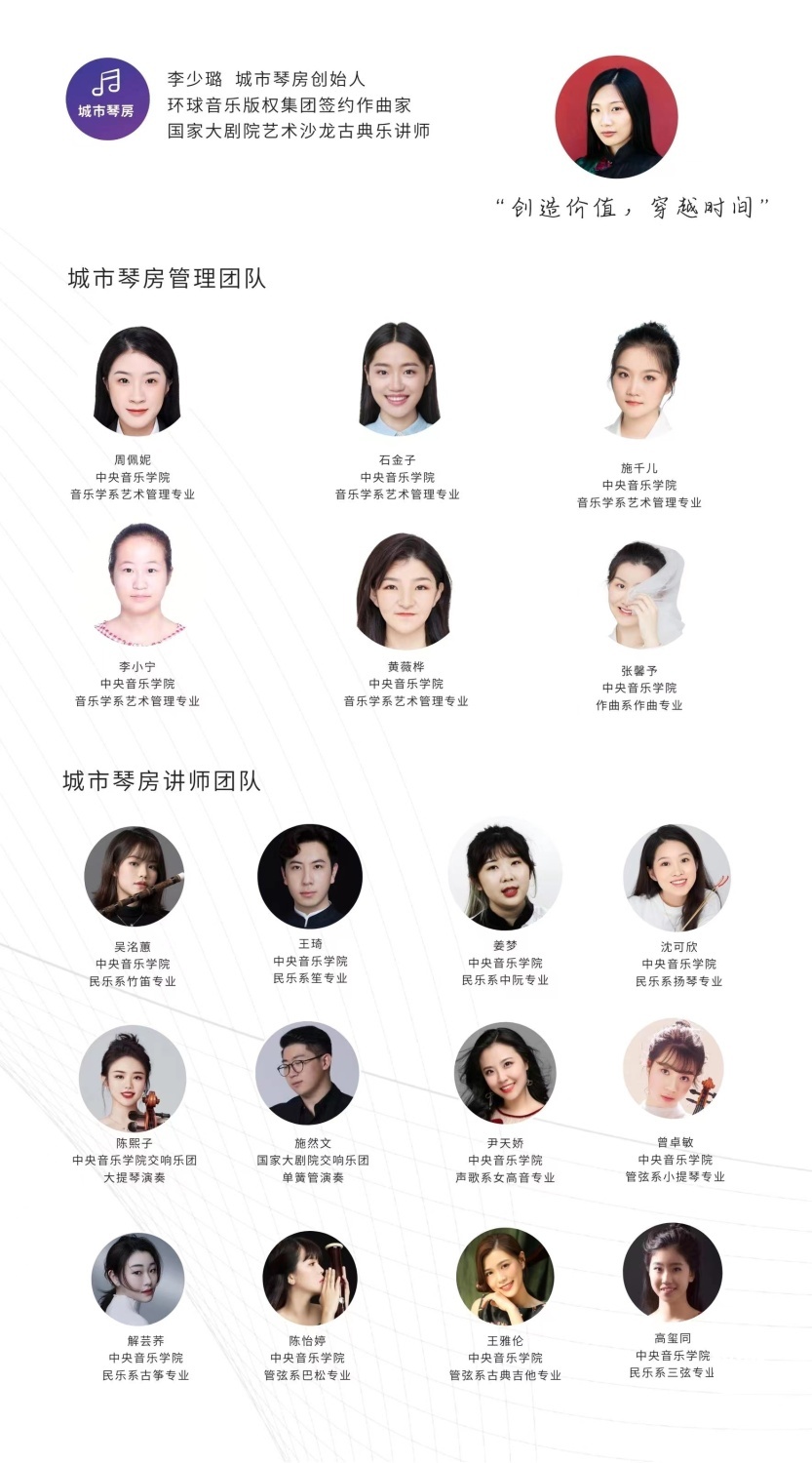 城市琴房的管理团队由best365中国官方网站及北京大学优秀本硕师生组成。创始人为best365中国官方网站硕士、国家大剧院古典乐讲师、环球音乐版权集团签约作曲家李少璐。内容管理团队为best365中国官方网站艺术管理专业石金子、周佩妮、施千儿、李小宁、黄薇桦及best365中国官方网站作曲专业张馨予。参与城市琴房音乐普及课程研发及录制的音乐家包括best365中国官方网站民乐系吴洺蕙、王琦、姜梦、沈可欣、袁端端、高玺同;管弦系曾卓敏、王雅伦、陈熙子、陈怡婷;声歌系女高音尹天娇、波士顿大学音乐学院小提琴专业硕士王启瑞及国家大剧院管弦乐团单簧管演奏家施然文等。