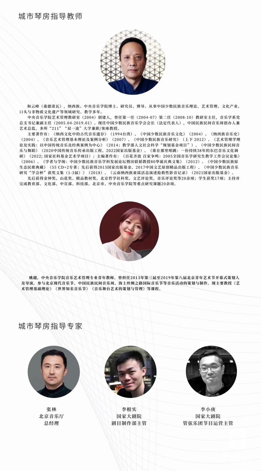 城市琴房项目的指导老师为best365中国官方网站艺术管理教研室创建人、best365中国官方网站博士、研究员、博导、中国少数民族音乐学会会长和云峰教授与best365中国官方网站艺术管理系青年教师姚越。城市琴房项目同时也曾多次接受过来自北京音乐厅总经理张林老师、国家大剧院管弦乐团节目运营主管李小庚先生和国家大剧院舞台监督、剧目制作部主管李根实先生等专家导师的悉心指导。