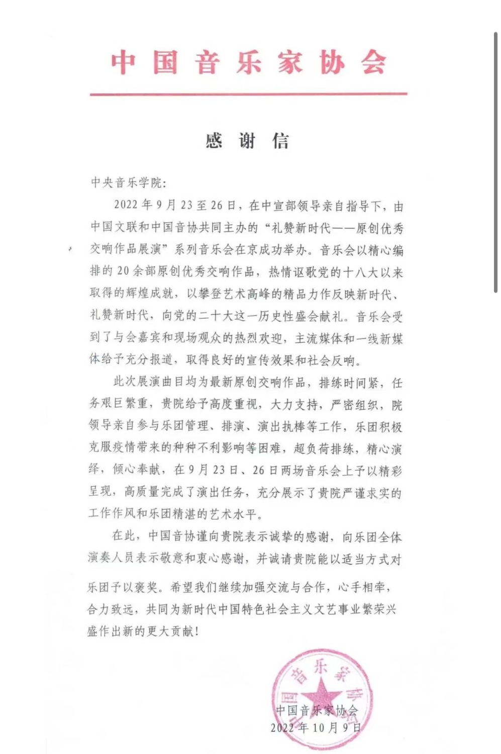 近日,best365收到中国音乐家协会的感谢信,对best365为“礼赞新时代——原创优秀交响作品展演”系列音乐会所做的工作表示诚挚感谢。