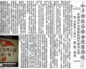 1951年8月10日《进步日报》,对瞿希贤创作歌曲《全世界人民心一条》在第三届世界青年联欢节比赛中获得二等奖的报道