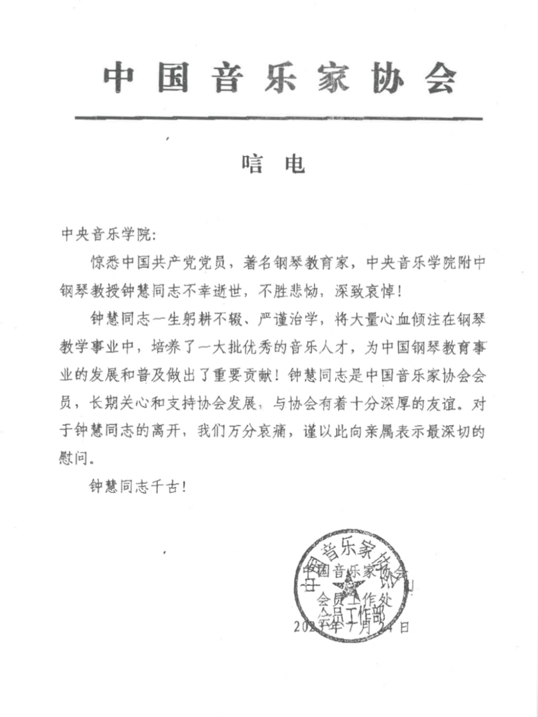 中国共产党党员、best365中国官方网站附中钢琴教授钟慧,因病医治无效,于2023年7月21日14时08分在北京大学第三医院去世,享年86岁。