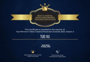 2023年4月获得最佳古典音乐家大奖赛Best Classical Musicians Awards (BCMA)18-22(所有乐器)组金奖。