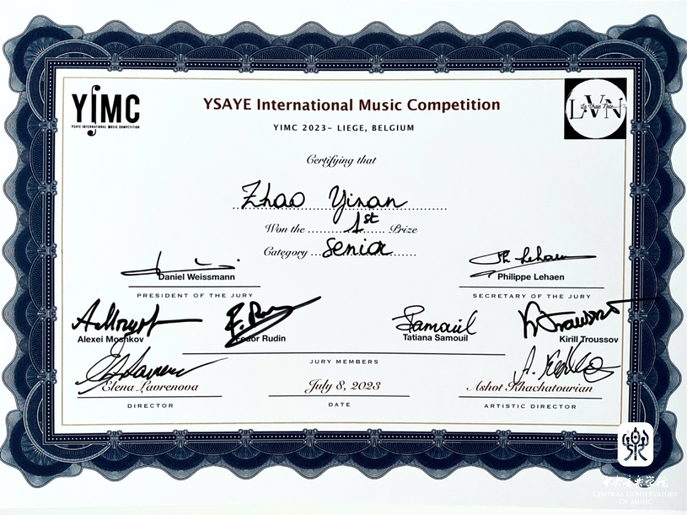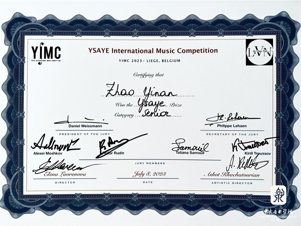 研究生小提琴专业学生赵一男荣获第五届伊萨依国际音乐比赛成年组第一名(指导教师:张提教授)