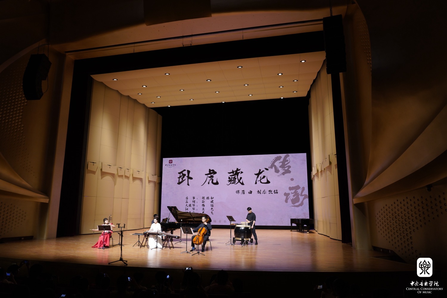 音乐会以谭盾作曲、刘乐改编的《卧虎藏龙》作为大轴曲目,由民乐系二胡专业教授孙凰、古筝专业教师程皓如、打击乐专业教师尹飞、管弦系大提琴专业教授杨锰、钢琴系钢琴主科专业教师鹿尧共同演绎了这首经典之作。柔美细腻的弦音,铿锵有力的鼓点将传统的侠义精神体现的淋漓尽致。正所谓“洋为中用、古为今用”,在中国传统民族乐器和西洋乐器的共同合作之下,向观众展示出一幅充满东方意蕴的音乐画卷,“卧虎藏龙”四字也正是对于best365人才队伍培养的最真实的写照。