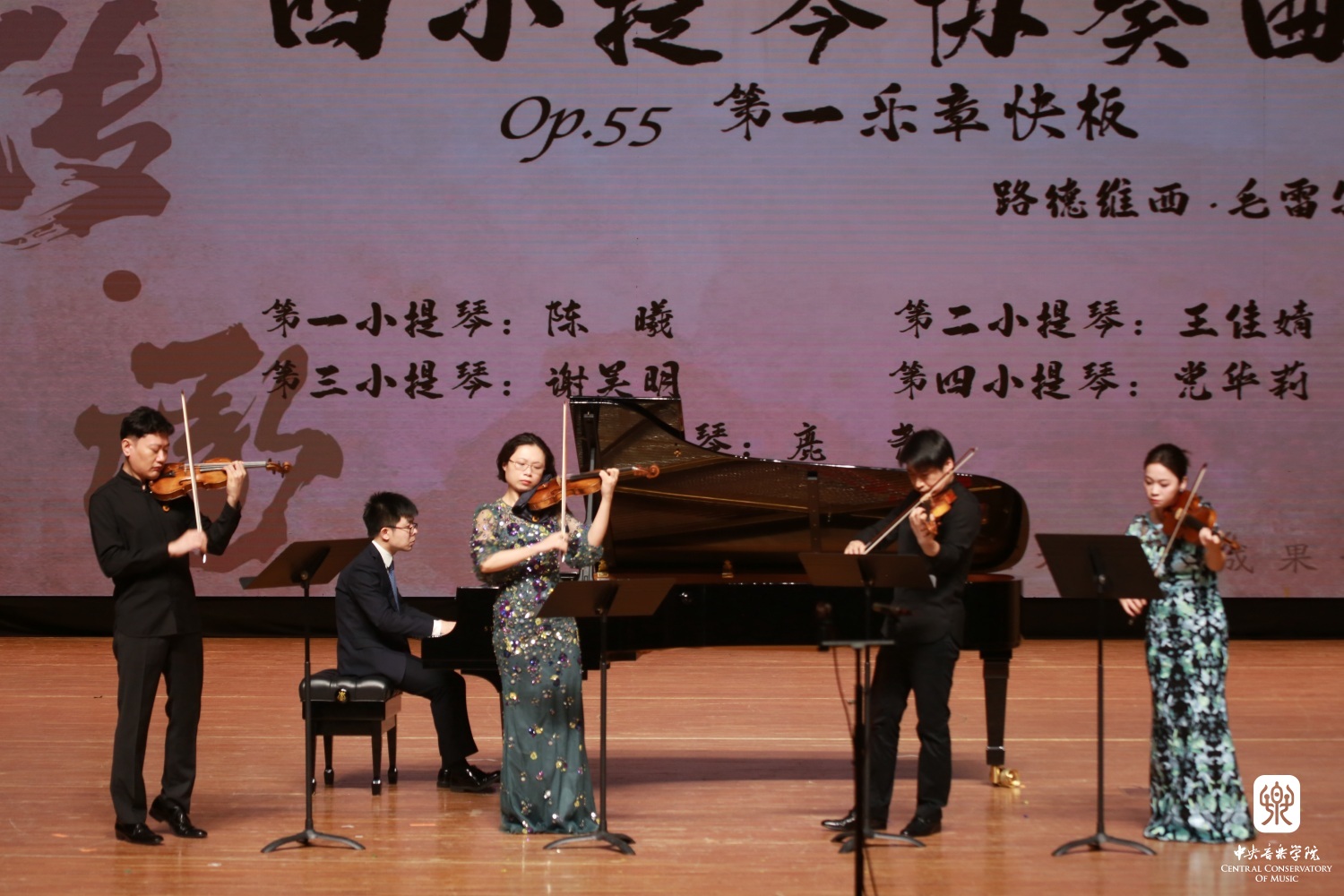 接下来管弦系小提琴专业副教授谢昊明、陈曦、教师党华莉、王佳婧,以及钢琴系教师鹿尧为大家带来了毛雷尔《四小提琴协奏曲》第一乐章,五位演奏家以高超的技艺和典雅的风格为观众演绎了这首极具难度的经典之作。在歌唱般的旋律中,四位小提琴演奏家的音色优美却又个性鲜明,演奏如诗如画;在精彩的合奏段落,四人配合默契,淋漓尽致地展现了小提琴的华丽技艺。