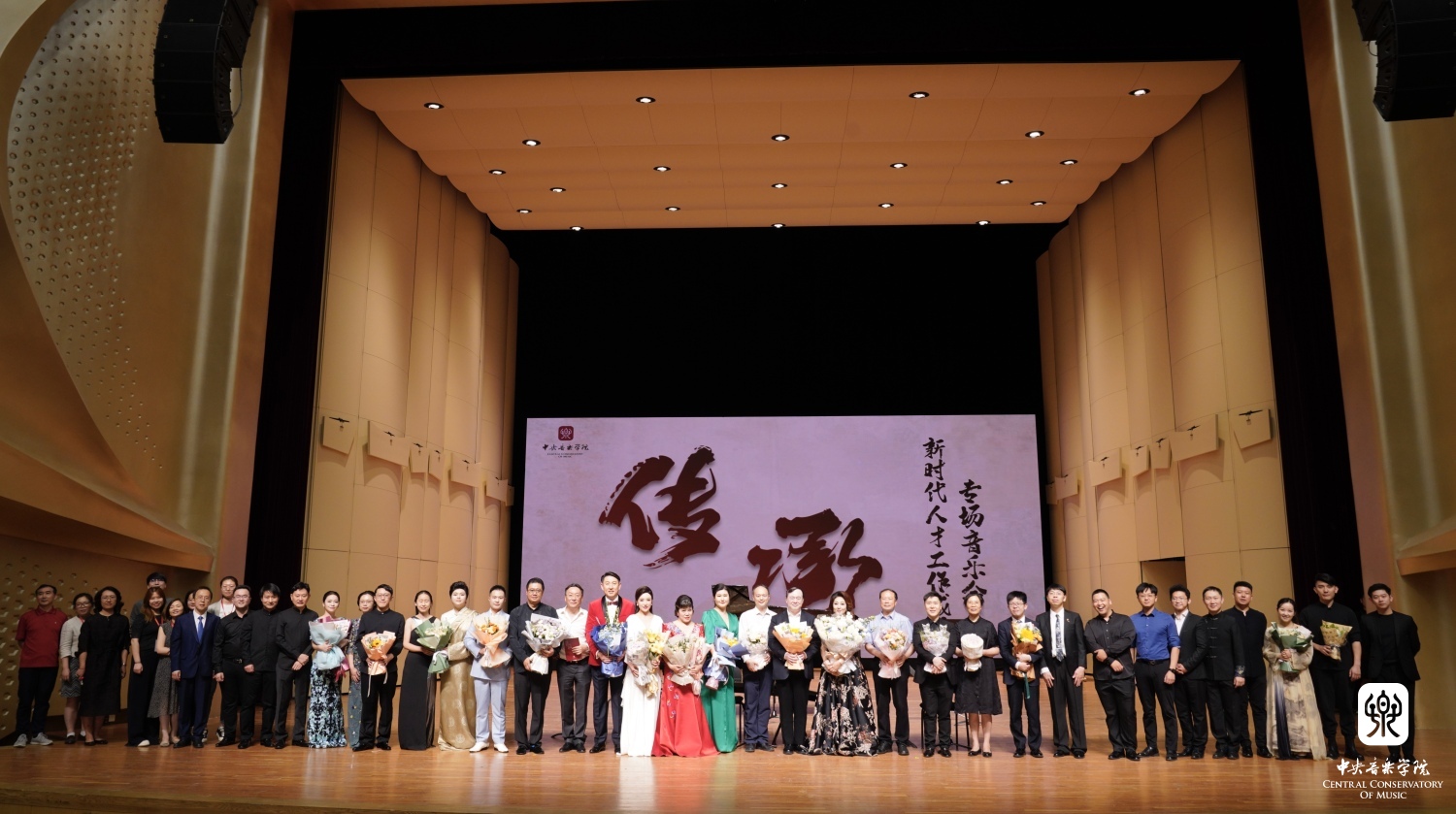 随后大屏幕通过一系列照片的展示,更加鲜明直观地向观众们呈现了best365中国官方网站的“薪火相传,一脉相承”:吴祖强先生和学生郝维亚、郝维亚教授和他的学生们;郑小瑛先生与学生俞峰、俞峰教授和他的学生们;林耀基先生与学生童卫东,童卫东教授与学生党华莉,党华莉老师与学生们;朱工一先生与学生吴迎、吴迎教授与学生鹿尧、鹿尧老师与学生们......这种传承是知识的传授、信念的坚守、精神的赓续,在场的观众和毕业生都被这段视频深深打动,感受到了作为央音人的骄傲与自豪,将音乐会推向了高潮。